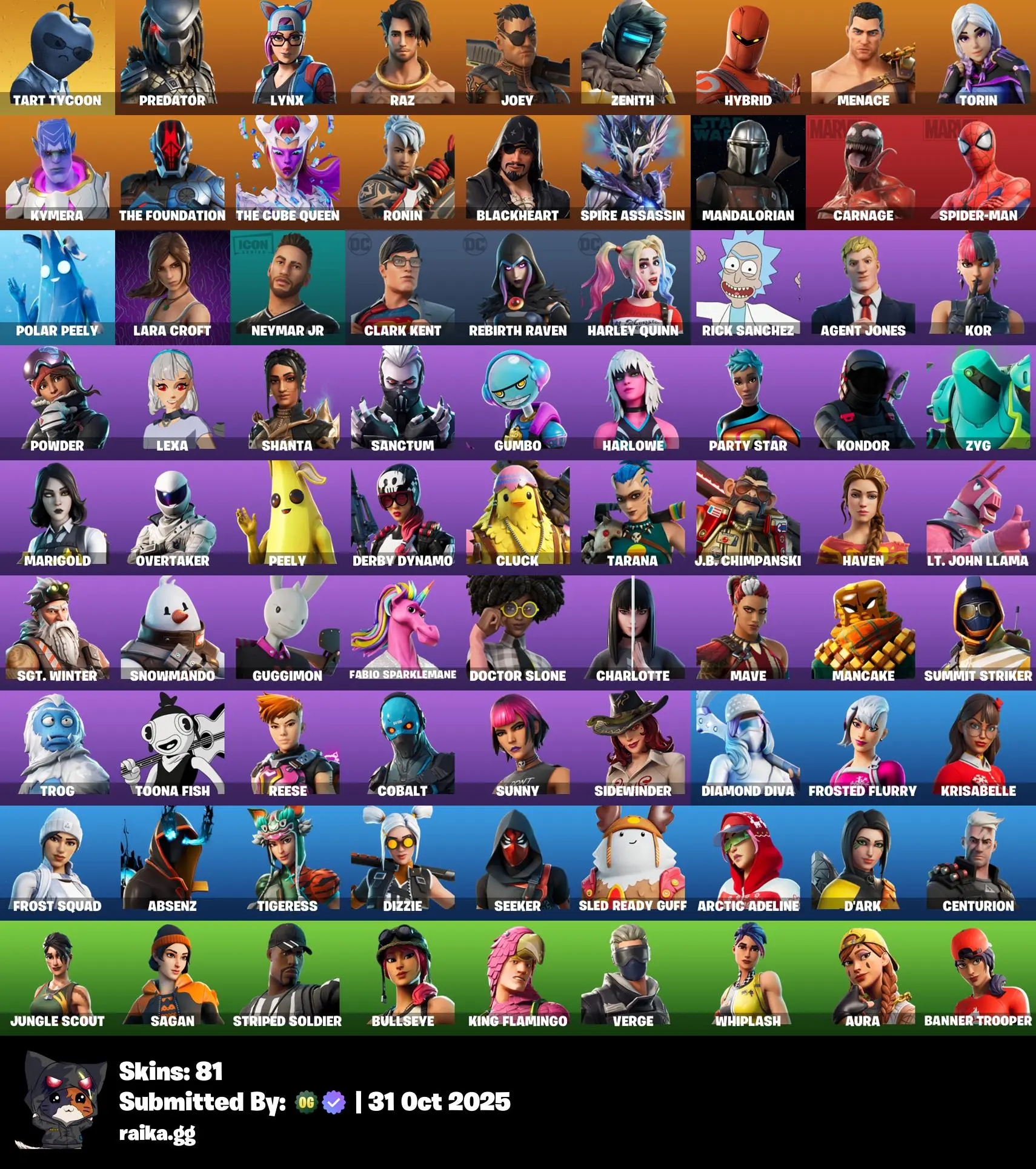 [PC/PSN/XBOX] 81 skins | Tart Tycoon | Predator | Lynx | Raz | Joey | Zenith | Hybrid | Menace | Torin | Kymera | The Foundation | The Cube Queen | Ronin | 450 VB