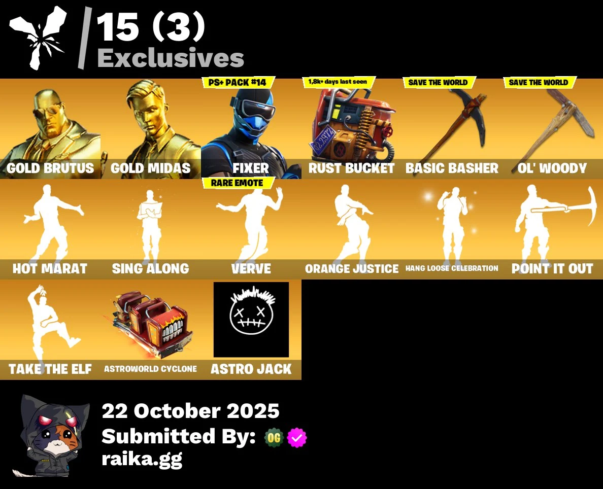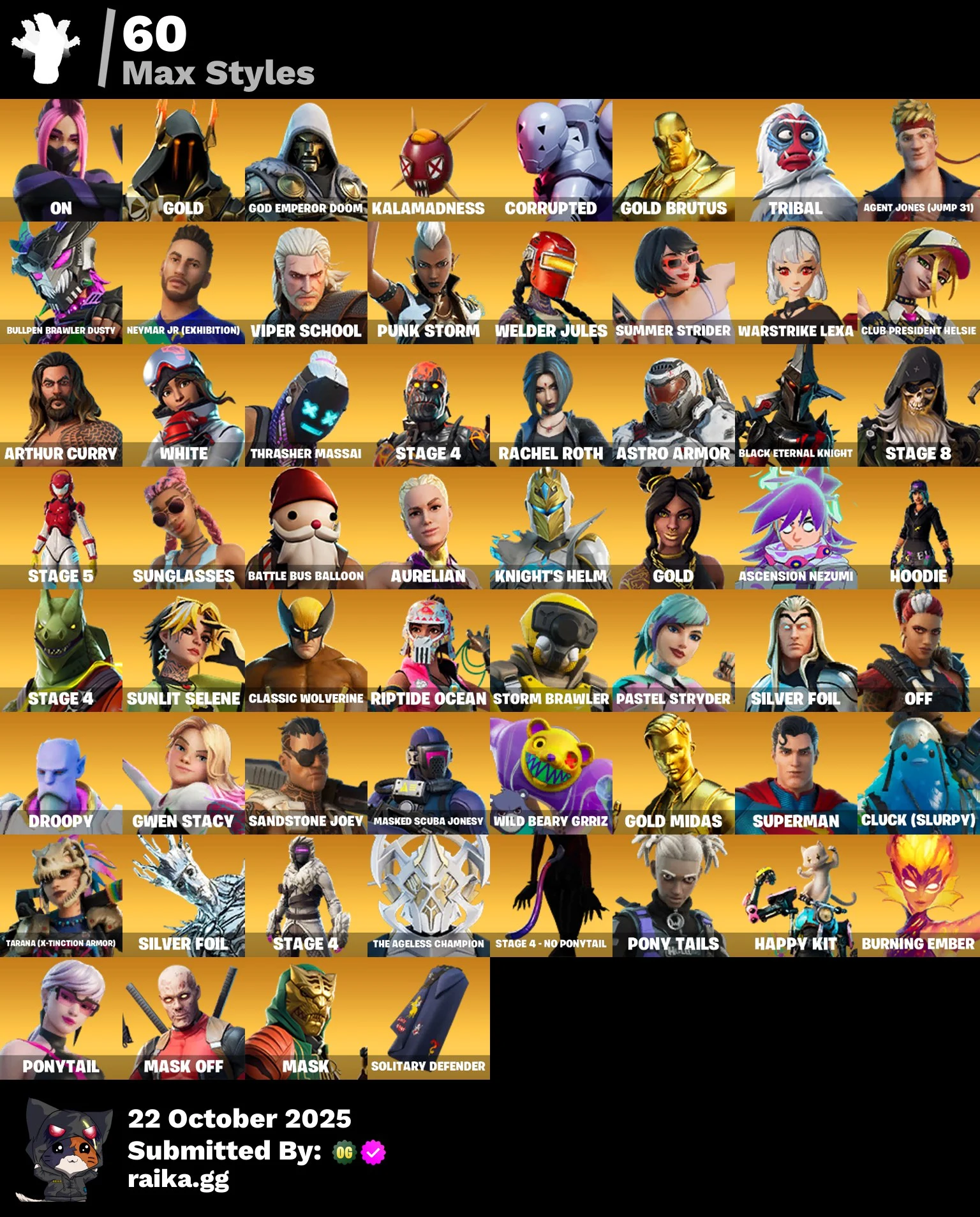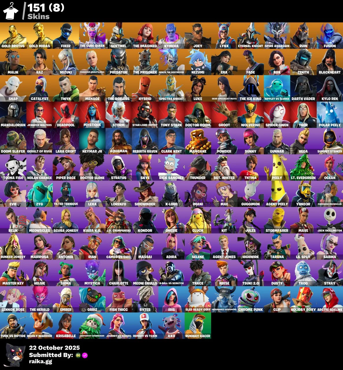 PC/PSN/Xbox/Nintendo 151 skins | Gold Brutus | Point It Out | Gold Midas | Fixer | The Cube Queen | Sentinel | The Imagined | Kymera | Joey | Lynx | Eternal Knight | 600 VB