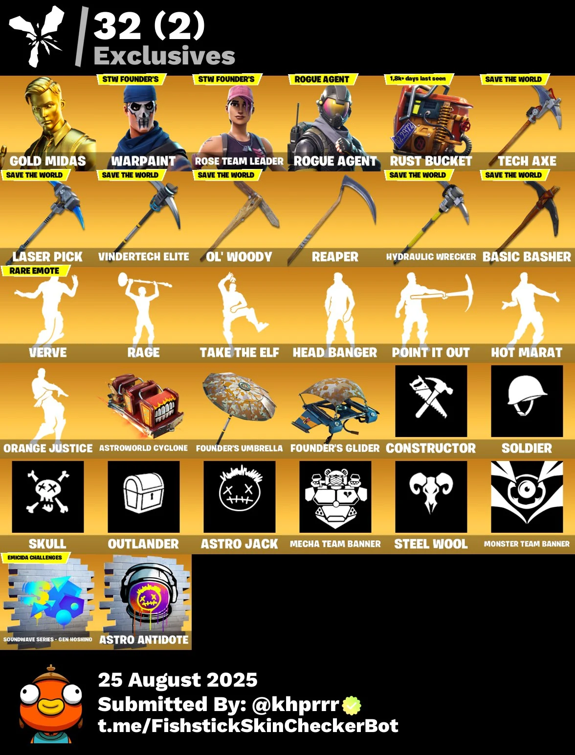 *[PC/PSN/XBOX/Nintendo] 166 skins F/A : | OG STW | Gold Midas | Rogue Agent | Rust Bucket | Tech Axe | Laser Pick | Vindertech Elite | Ol' Woody | Reaper | Hydraulic Wrecker