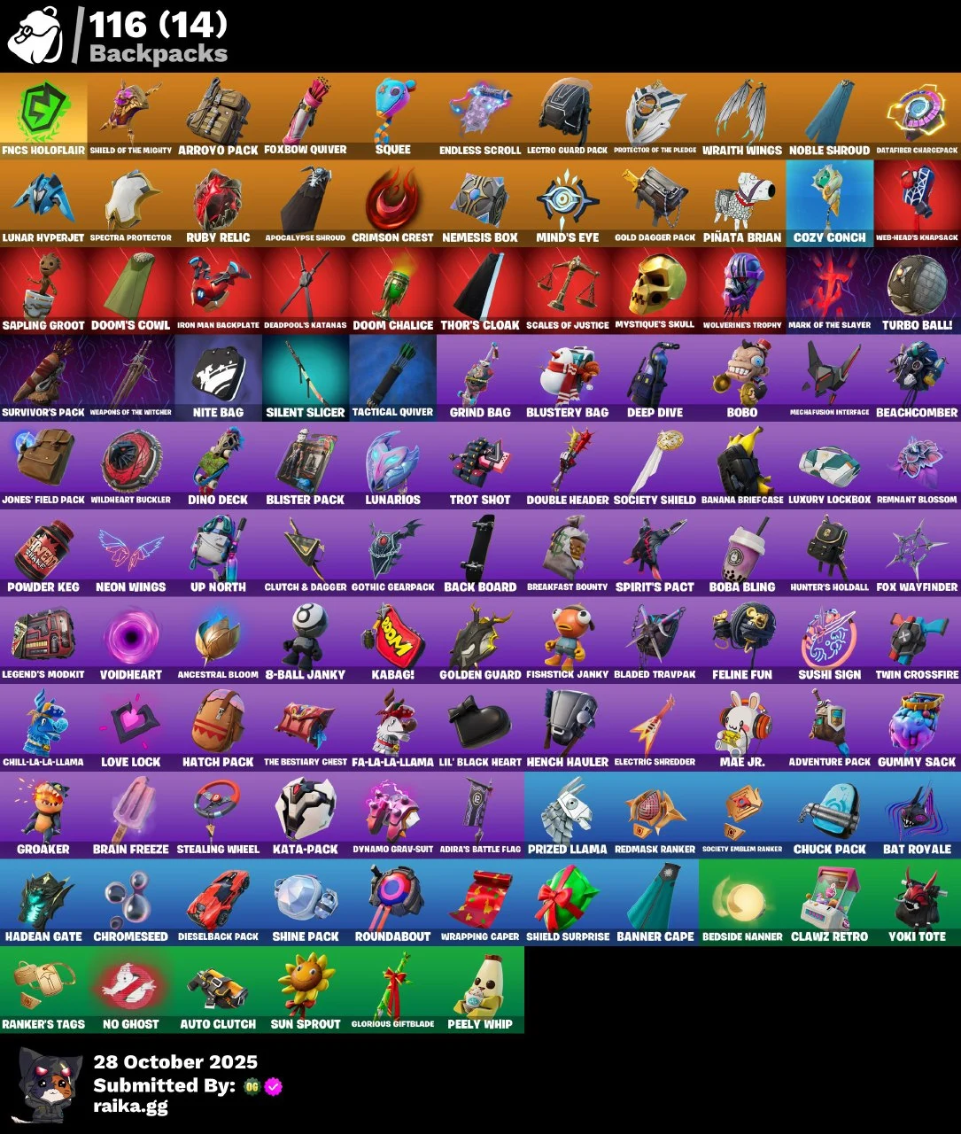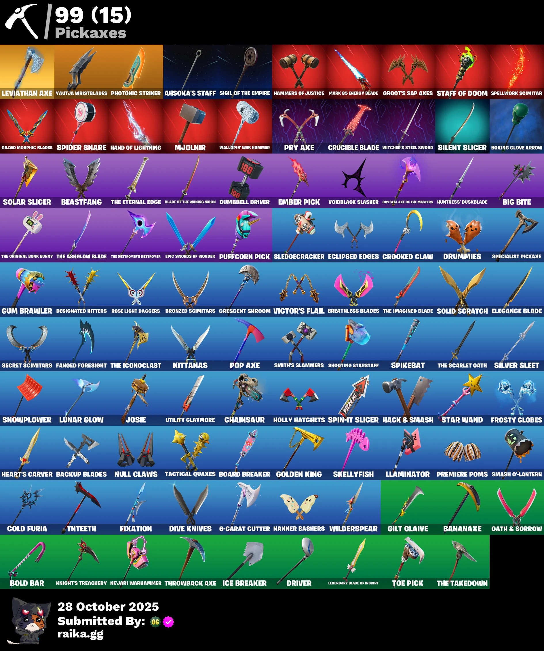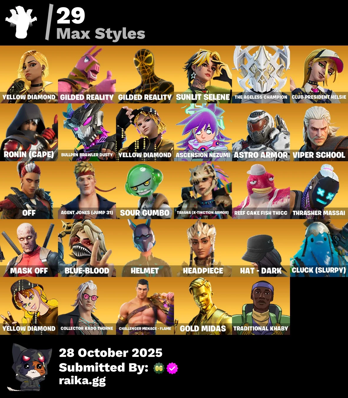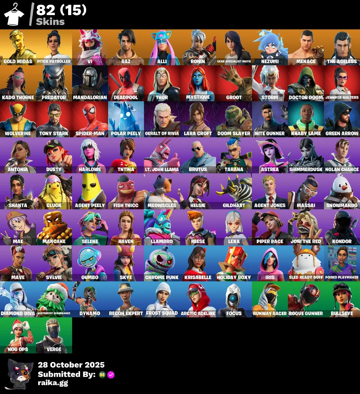 PC/PSN/Xbox/Nintendo 82 skins | Leviathan Axe | Gold Midas | Pitch Patroller | Vi | Raz | Alli | Ronin | Gear Specialist Maya | Nezumi | Menace | The Ageless | Kado Thorne | 200 VB