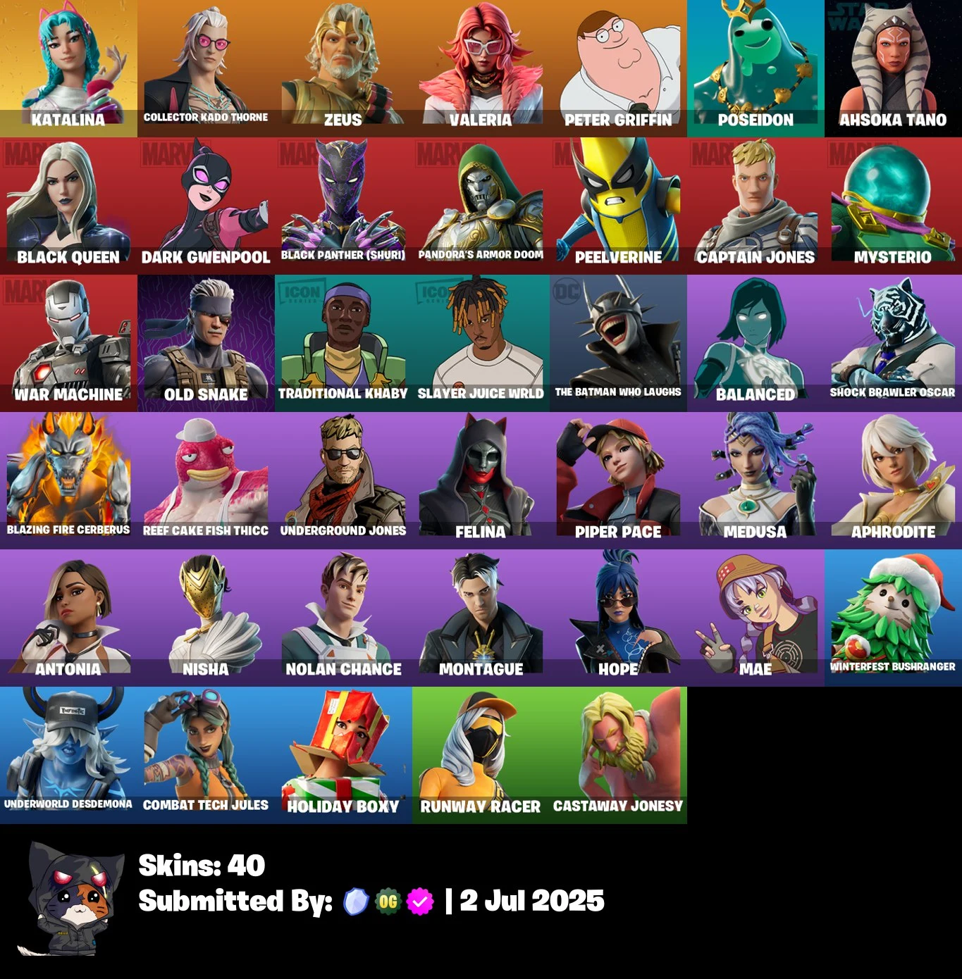 ⭐[PC/PSN/XBOX/NINTENDO/MOBILE] 40 SKINS | KATALINA | COLLECTOR KADO THORNE | ZEUS | VALERIA | PETER GRIFFIN | POSEIDON | AHSOKA TANO | BLACK QUEEN | DARK GWENPOOL | BLACK PANTHER (SHURI) | PANDORA'S ARMOR DOOM | 1000 VBUCKS | FULL EMAIL ACCESS