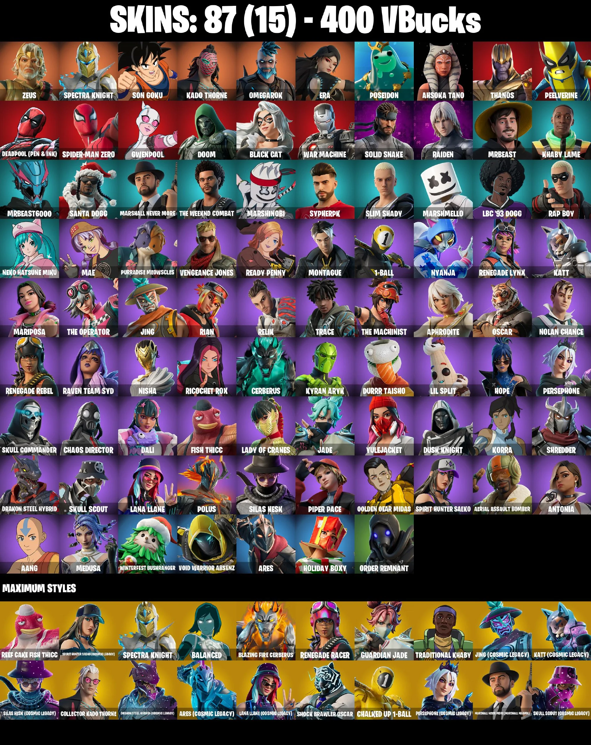 ⭐ [PC/PSN/XBOX/NINTENDO/MOBILE] 87 SKINS | THANOS | MRBEAST | MARSHMELLO | RAP BOY | MARSHALL NEVER MORE | THE WEEKND COMBAT | SYPHERPK | NEKO HATSUNE MIKU | RAVEN TEAM SYD | AERIAL ASSAULT BOMBER | AANG | SHREDDER | 400 VBUCKS | EMAIL