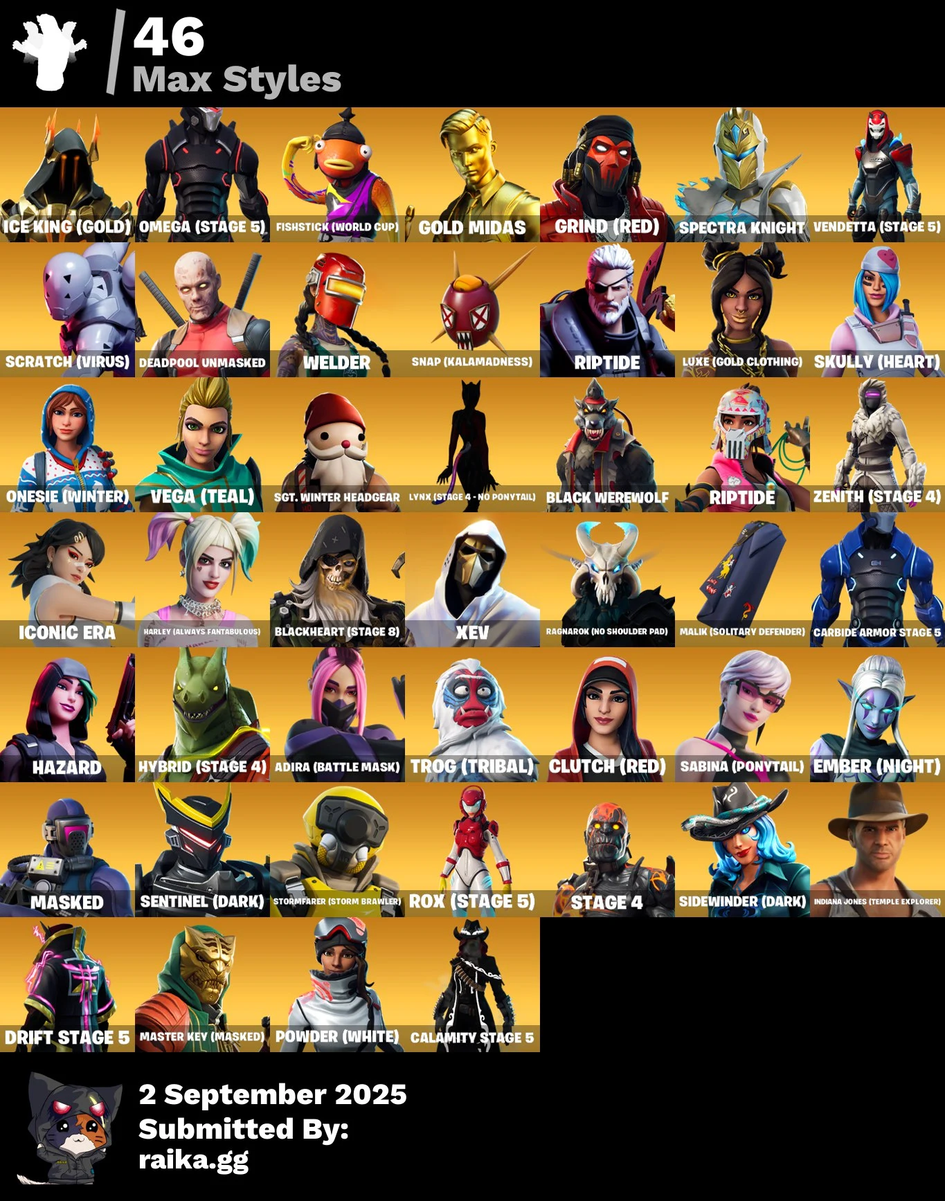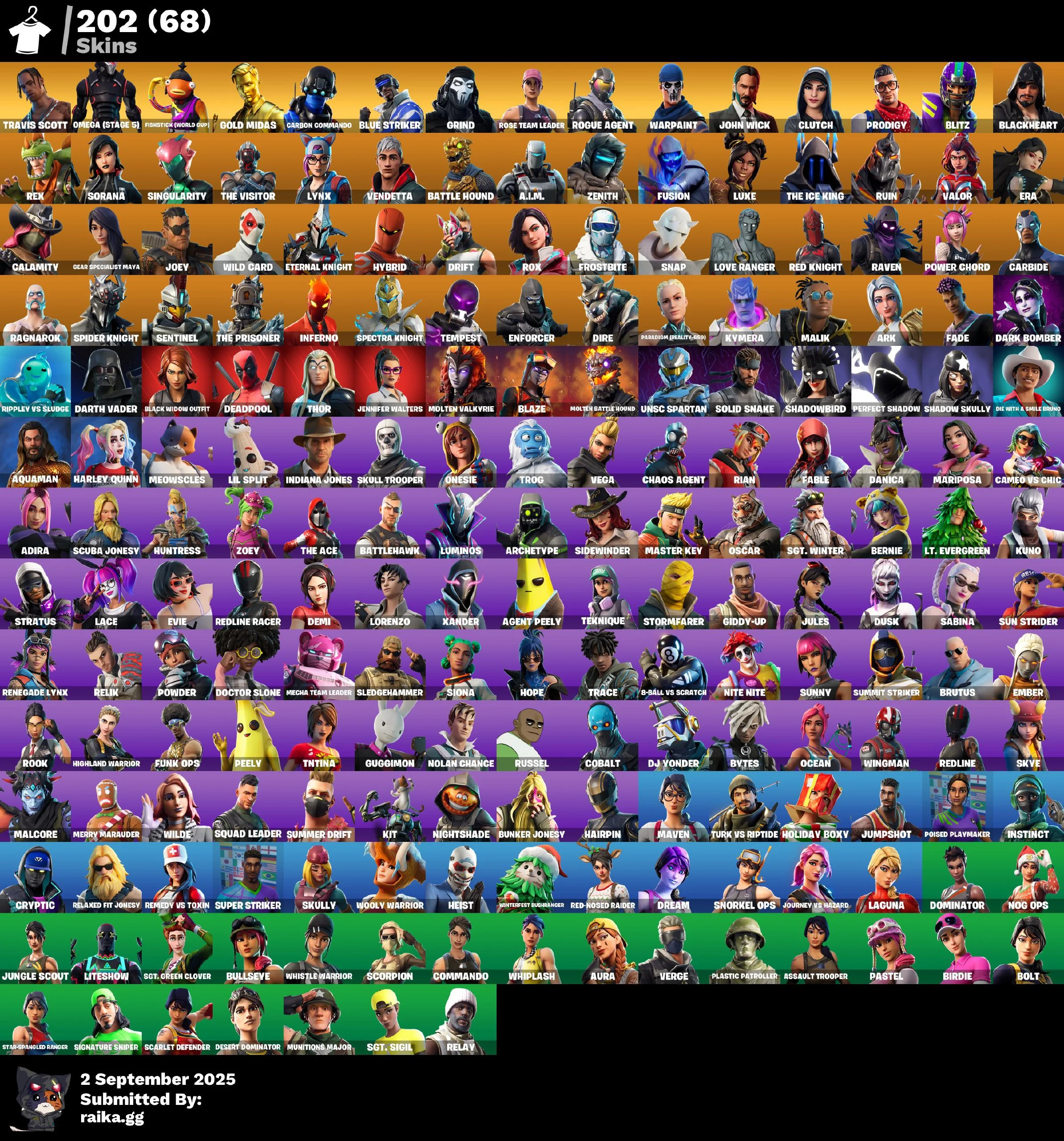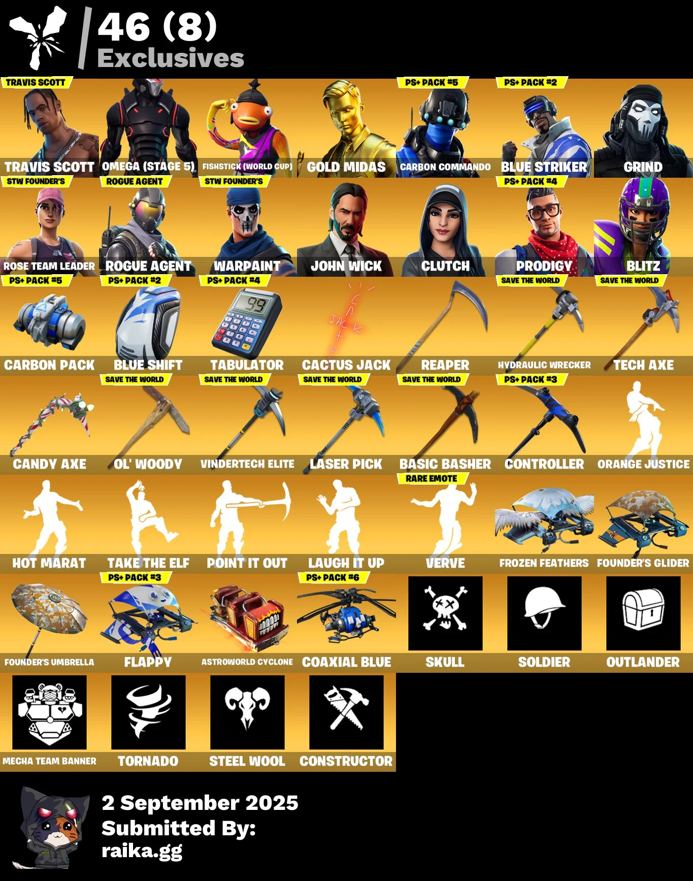 [PC/PS/XBOX] 202 Skins ✔ OG STW ✔ Travis Scott ✔ Omega (stage 5) ✔ Fishstick (World Cup) ✔ Gold Midas ✔ Carbon Commando ✔ Blue Striker ✔ 4555 VB