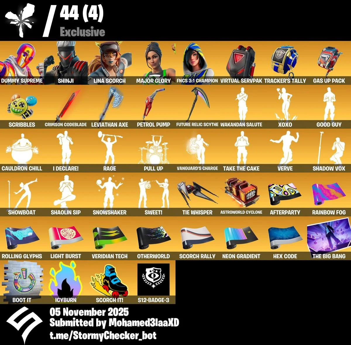 [PC/XBL/PSN] | 253 Skins | Dummy Supreme | Shinji | Lina Scorch | Major Glory | FNCS 3:1 Champion | Crimson Codeblade | Leviathan Axe | Petrol Pump | S12-Badge-3 | 700 VB