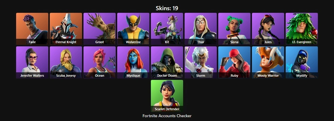 PC/XBOX 19 Skins⚡ | Fade | Eternal Knight | Groot | Wolverine | Kit | Thor | Siona | Jules | Lt. Evergreen | Jennifer Walters | Scuba Jonesy | Ocean