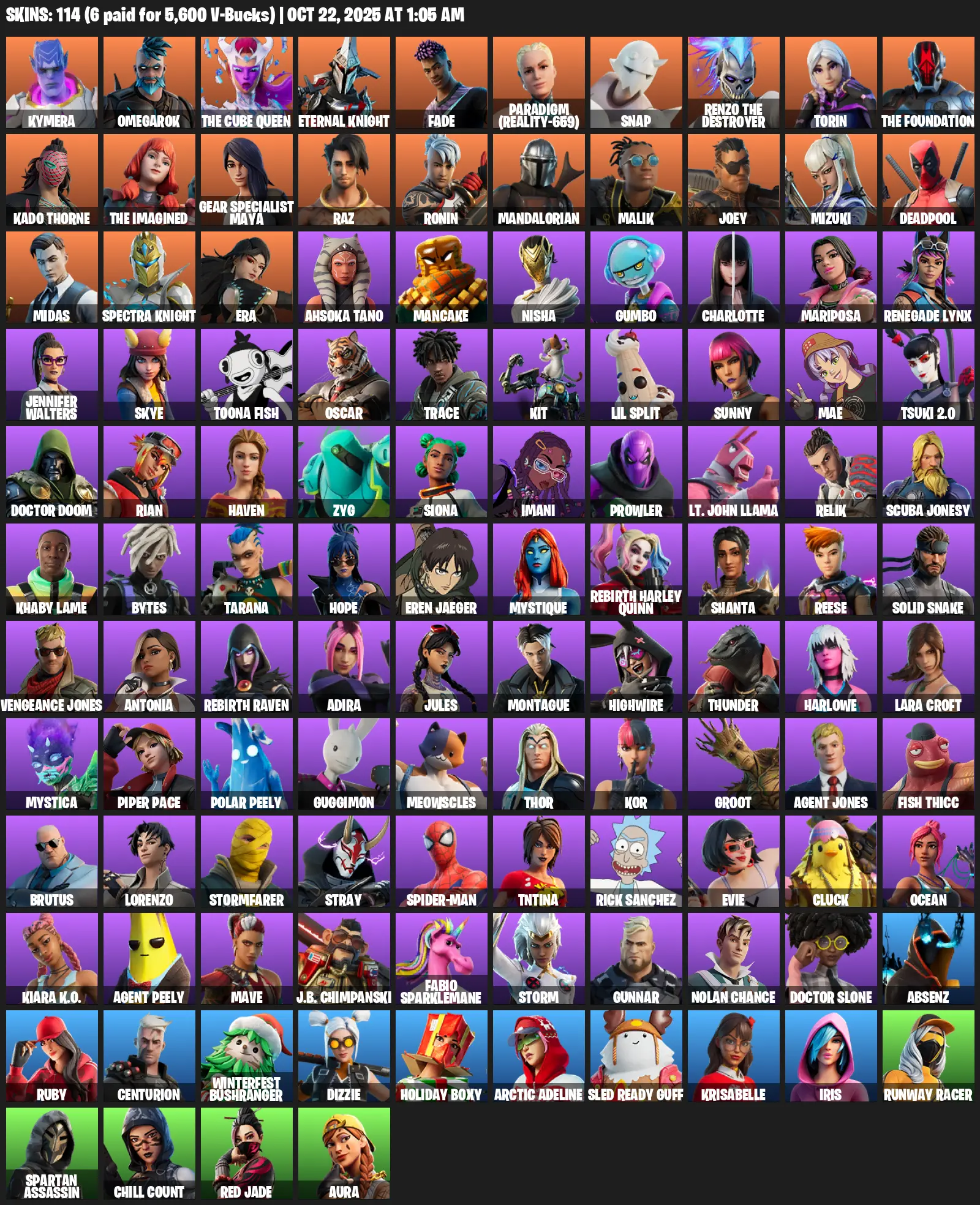 [PC/XBOX/PSN] 114 Skins | Kymera | Omegarok | The Cube Queen | Eternal Knight | Fade | Paradigm (Reality-659) | Snap | Renzo the Destroyer | Torin | The Foundation | Kado Thorne | The Imagined | Gear Specialist Maya | Raz | Ronin | Mandalorian | Malik
