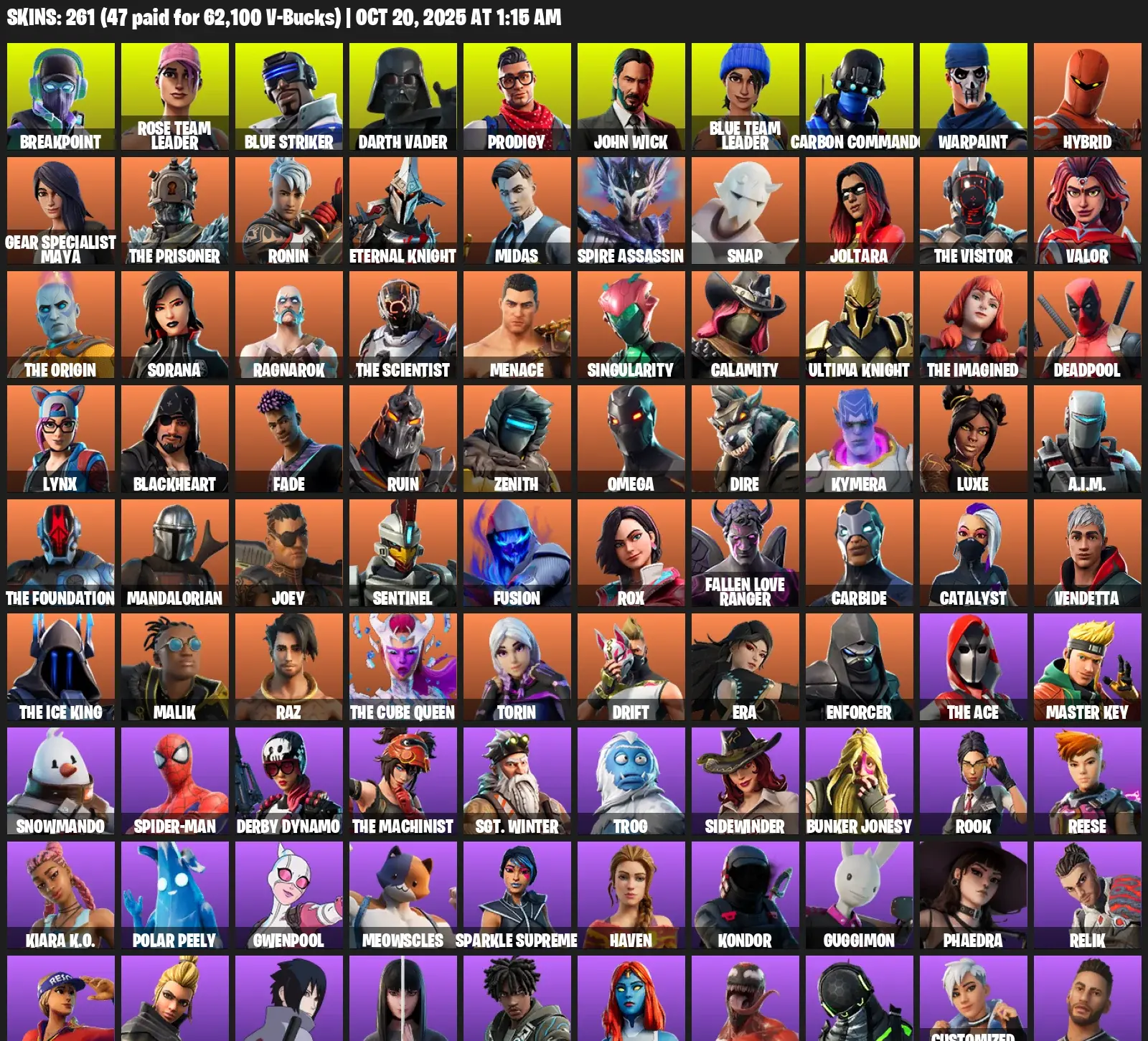 [PC/XBOX/PSN] 261 Skins | Breakpoint | Rose Team Leader | Blue Striker | Darth Vader | Prodigy | John Wick | Blue Team Leader | Carbon Commando | Warpaint | Hybrid | Gear Specialist Maya | The Prisoner | Ronin | Eternal Knight | Midas | Spire Assassin