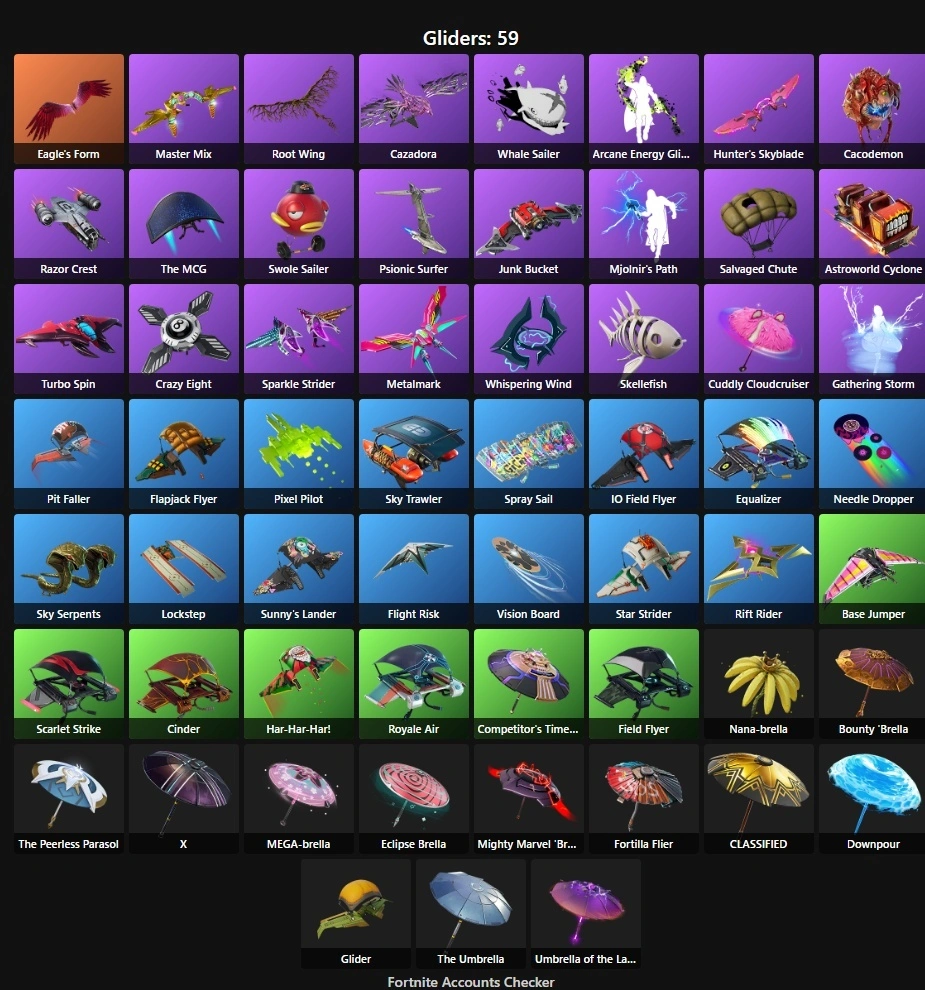 ⭐ Some Gliders = Eagle's Form, Master Mix, Root Wing, Cazadora, Whale Sailer, Arcane Energy Glider, Hunter's Skyblade, Cacodemon, Razor Crest, The MCG