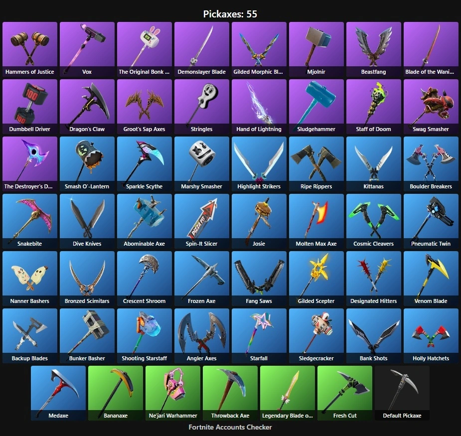 ⭐ Some Pickaxes = Hammers of Justice, Vox, The Original Bonk Bunny, Demonslayer Blade, Gilded Morphic Blades, Mjolnir, Beastfang, Blade of the Waning Moon, Dumbbell Driver, Dragon's Claw