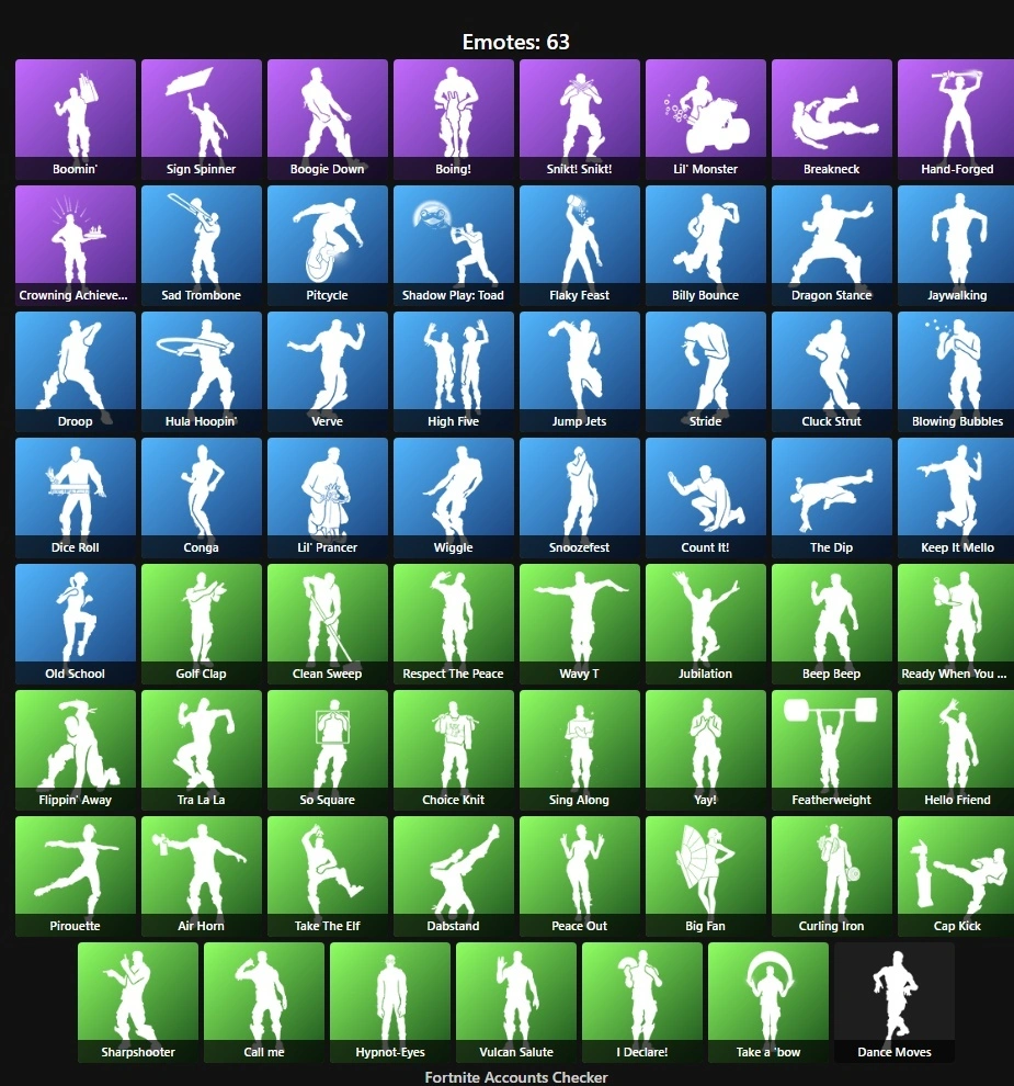 ⭐ Some Emotes = Boomin', Sign Spinner, Boogie Down, Boing!, Snikt! Snikt!, Lil' Monster, Breakneck, Hand-Forged, Crowning Achievement, Sad Trombone