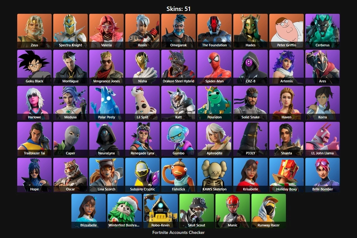 PC/XBOX/PSN 51 Skins⚡ | Zeus | Spectra Knight | Valeria | Ronin | Omegarok | The Foundation | Hades | Peter Griffin | Cerberus | Goku Black | Montague