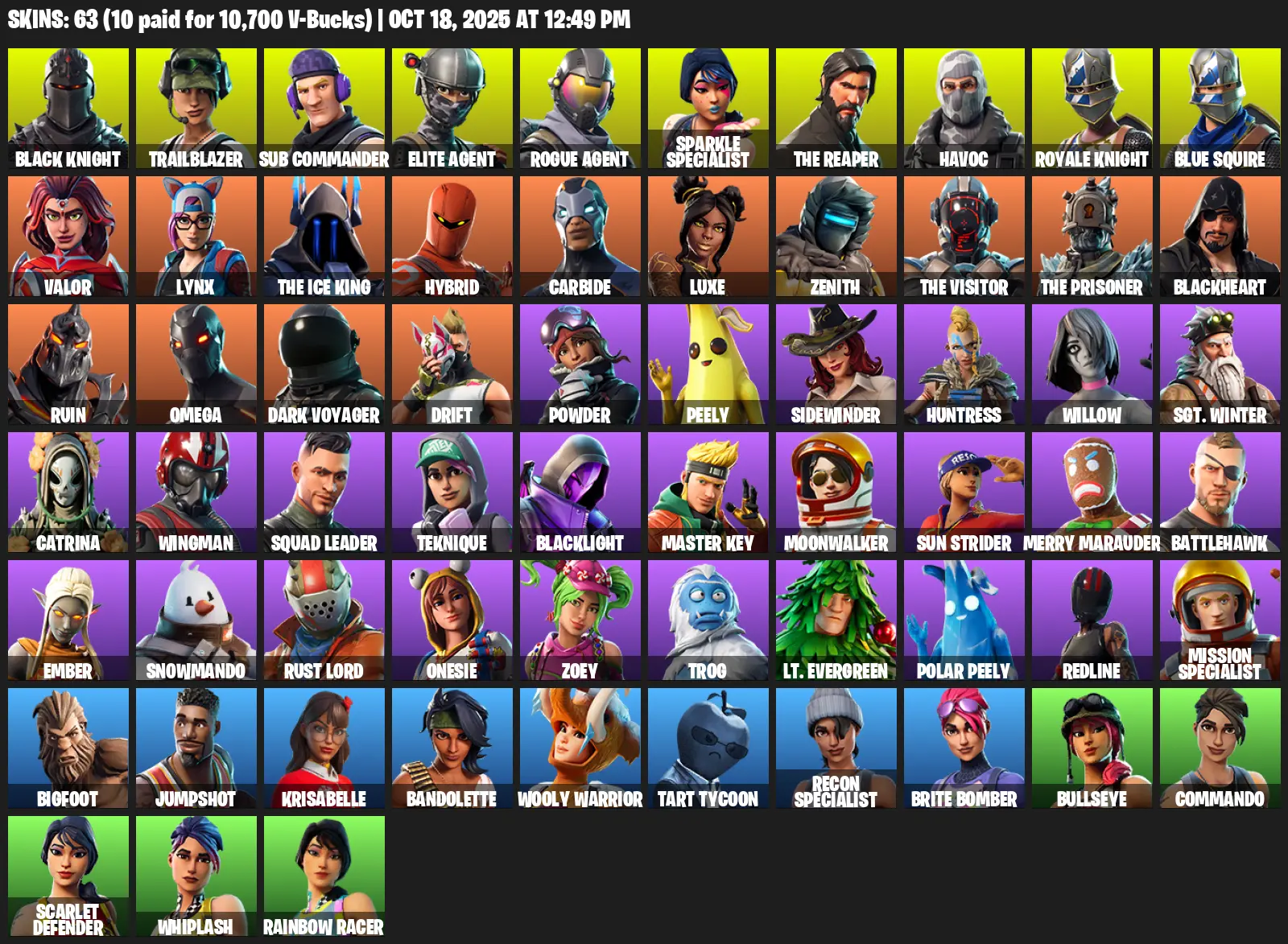 [PC/XBOX/PSN] 63 Skins | Black Knight | Trailblazer | Sub Commander | Elite Agent | Rogue Agent | Sparkle Specialist | The Reaper | Havoc | Royale Knight | Blue Squire | Valor | Lynx | The Ice King | Hybrid | Carbide | Luxe | Zenith | The Visitor