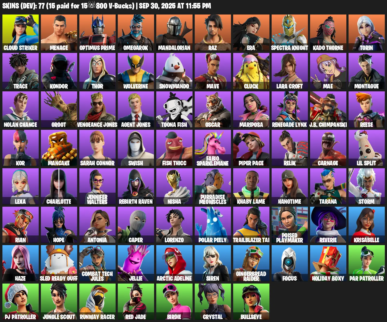 [PSN/PC] 77 Skins | Cloud Striker | Menace | Optimus Prime | Omegarok | Mandalorian | Raz | Era | Spectra Knight | Kado Thorne | Torin | Trace | Kondor | Thor | Wolverine | Snowmando | Mave | Cluck | Lara Croft | Mae | Montague | Nolan Chance | Groot