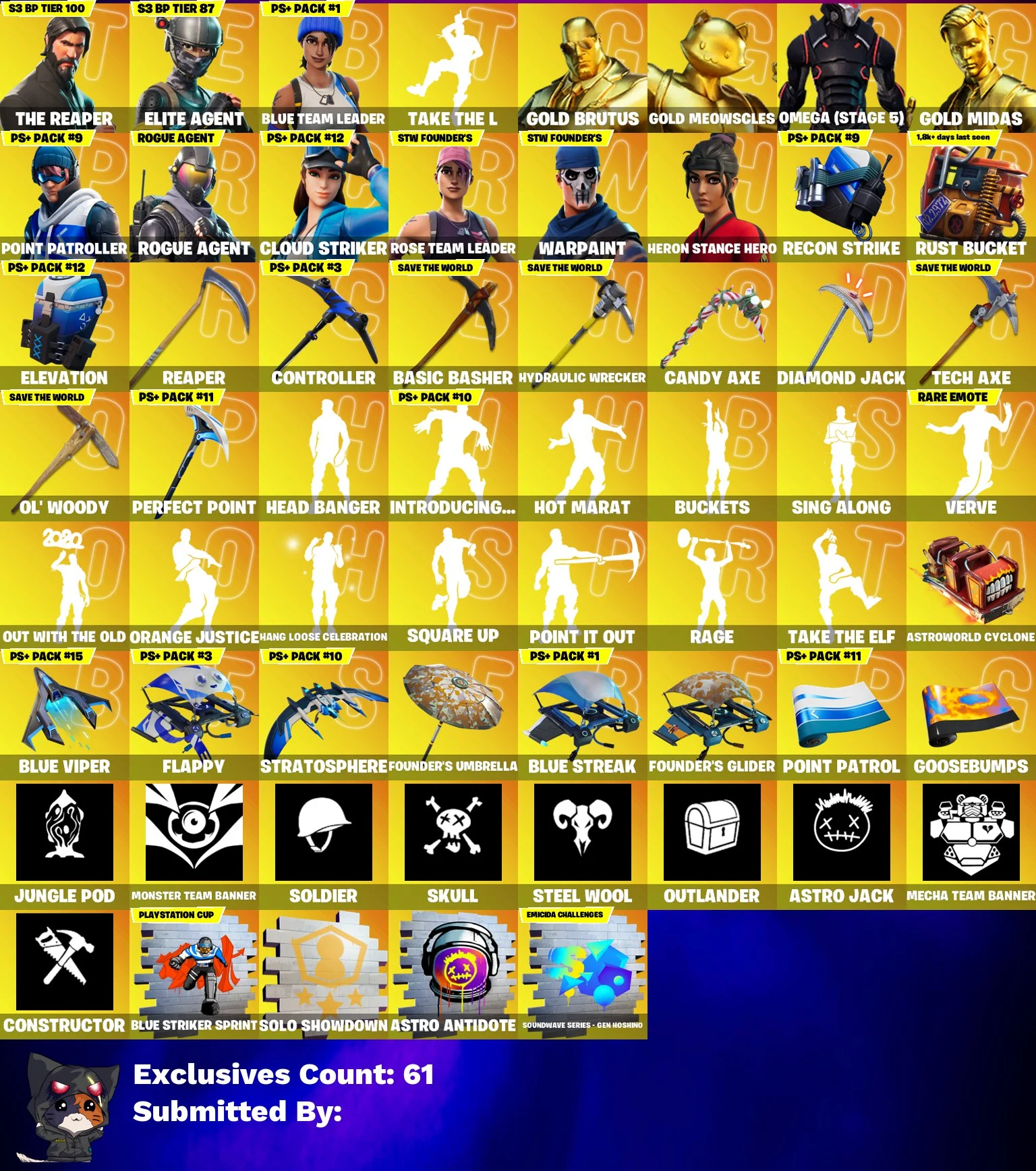 ๐๐ฅ STACKED OG ACCOUNT ๐ฅ๐ 196 SKINS ๐ THE REAPER ๐ ELITE AGENT ๐ TAKE THE L ๐ HERON STANCE HERO ๐ GOLD BRUTUS ๐ GOLD MEOWSCLES ๐ OMEGA (STAGE 5) ๐ GOLD MIDAS ๐ POINT PATROLLER ๐ ROGUE AGENT ๐ OG STW ๐ FULL ACCESS ๐