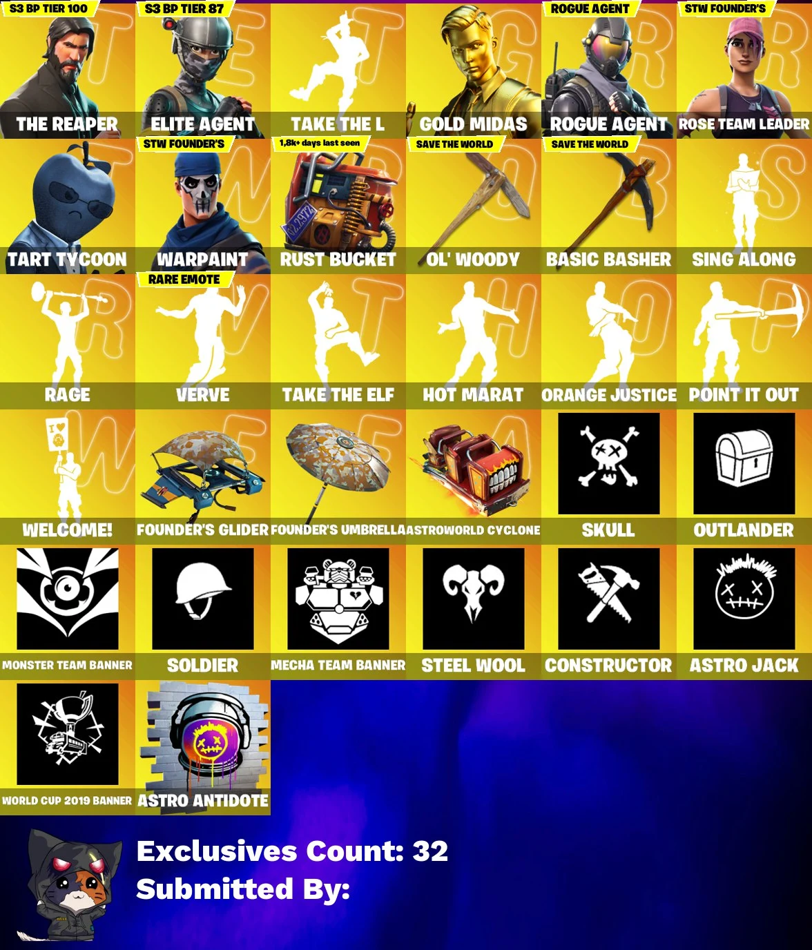 ๐๐ฅ STACKED OG ACCOUNT ๐ฅ๐ 218 SKINS ๐ THE REAPER ๐ TAKE THE L ๐ ELITE AGENT ๐ GOLD MIDAS ๐ ROGUE AGENT ๐ TART TYCOON ๐ ERA ๐ SNAP ๐ CATALYST ๐ NEZUMI ๐ THE PRISONER ๐ THE FOUNDATION ๐ HYBRID ๐ CARBIDE ๐ 560 VB ๐ OG STW ๐ FULL ACCESS ๐