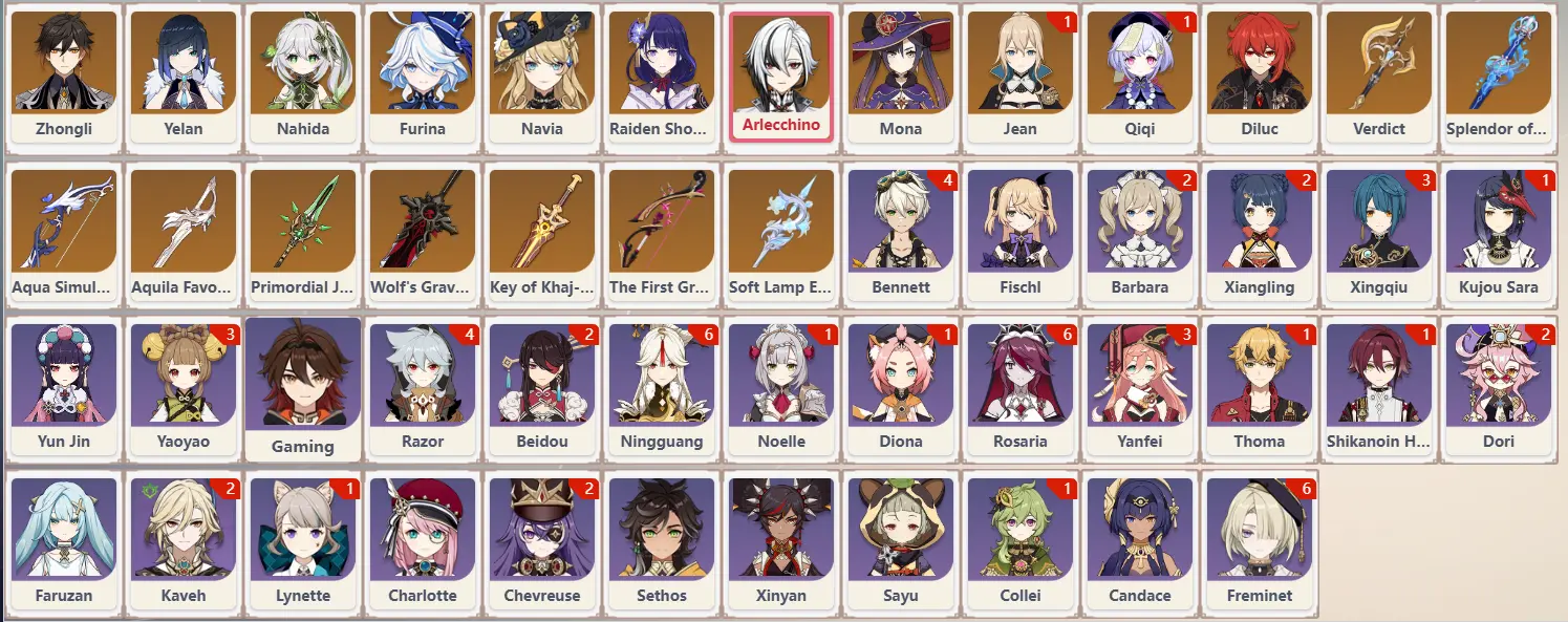 [NA]AR50|FiveStars*11||Zhongli+Arlecchino++Nahida++Raiden Shogun+[Yelan+Weapons]+[Furina+Weapons]+[Navia+Weapons]+Mona+Jean*1+Qiqi*1+Diluc ]Five Star Weapons*9||Four stars*30|For detailsplease see the description and picture