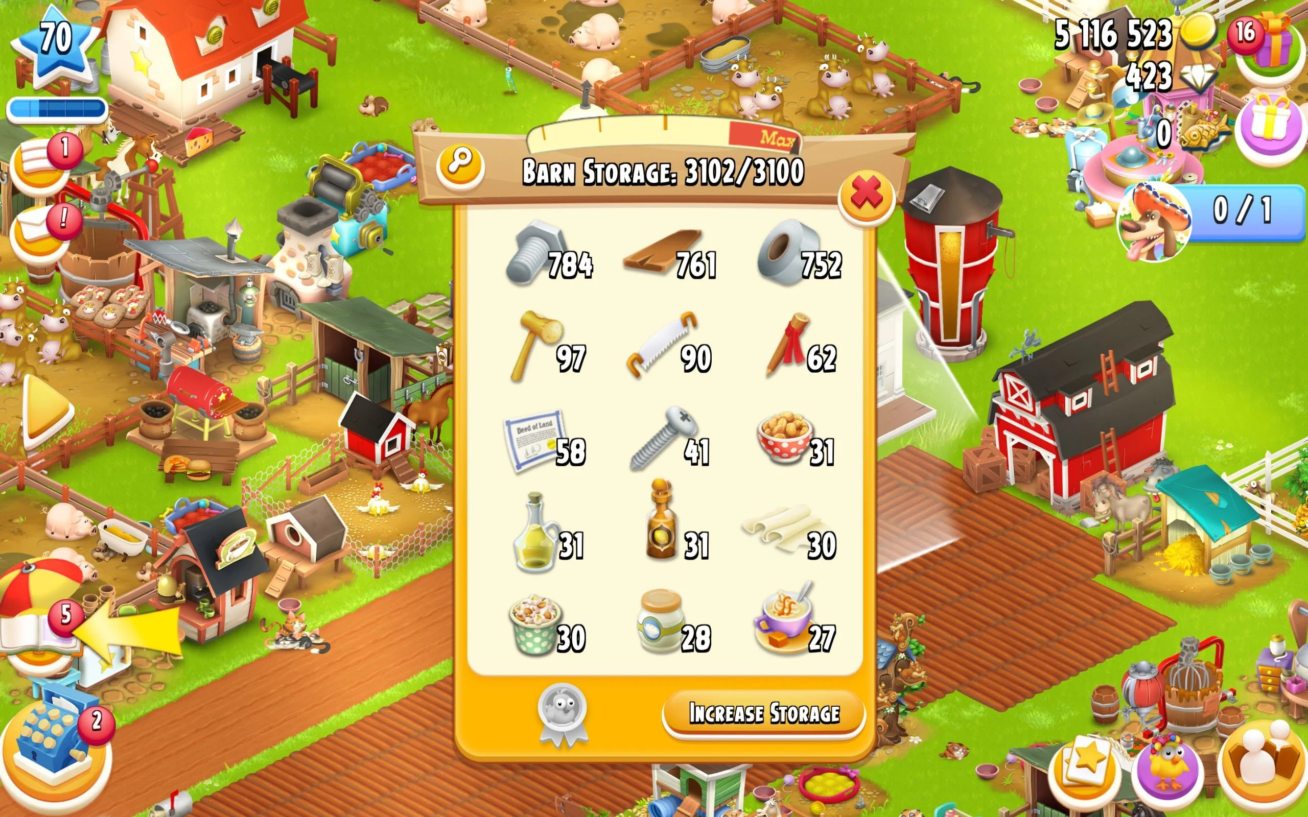 ✨️ CHEAPEST LEVEL 70 HAY DAY FARM 🌾 5116523 COINS🪙 3102/3100 BARN STORAGE💪 1089/1150 SILO STORAGE🎯 423 GEMS💎 SUPPORTS BOTH iOS&Android✅️ INSTANT DELIVERY 🚚