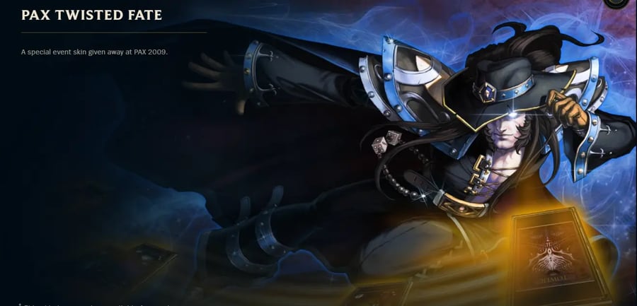 自2009年单次活动设定的2万限制以及过去十多年间PAX 歪曲命运(Twisted Fate)账号的流失,这款皮肤处于《英雄联盟》收藏皮肤中最稀有的行列。用于出售的PAX 歪曲命运账号池随着旧账号的逐渐停用只会越来越窄,而由于游戏内没有任何重新发布的途径,这个数字只会不断减少。