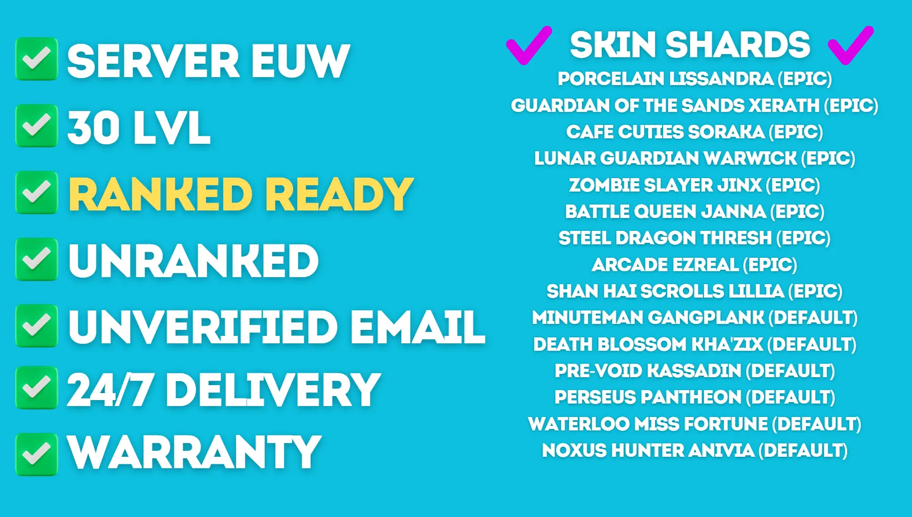 EUW 30 LvL ✅ Ranked Ready ✅ BE: 58290 ✅ Unverified ✅ Unranked ✅ Shards: Porcelain Lissandra, Guardian of the Sands Xerath, Cafe Cuties Soraka, Lunar Guardian Warwick, Zombie Slayer Jinx, Battle Queen Janna, Steel Dragon Thresh, Arcade Ezreal
