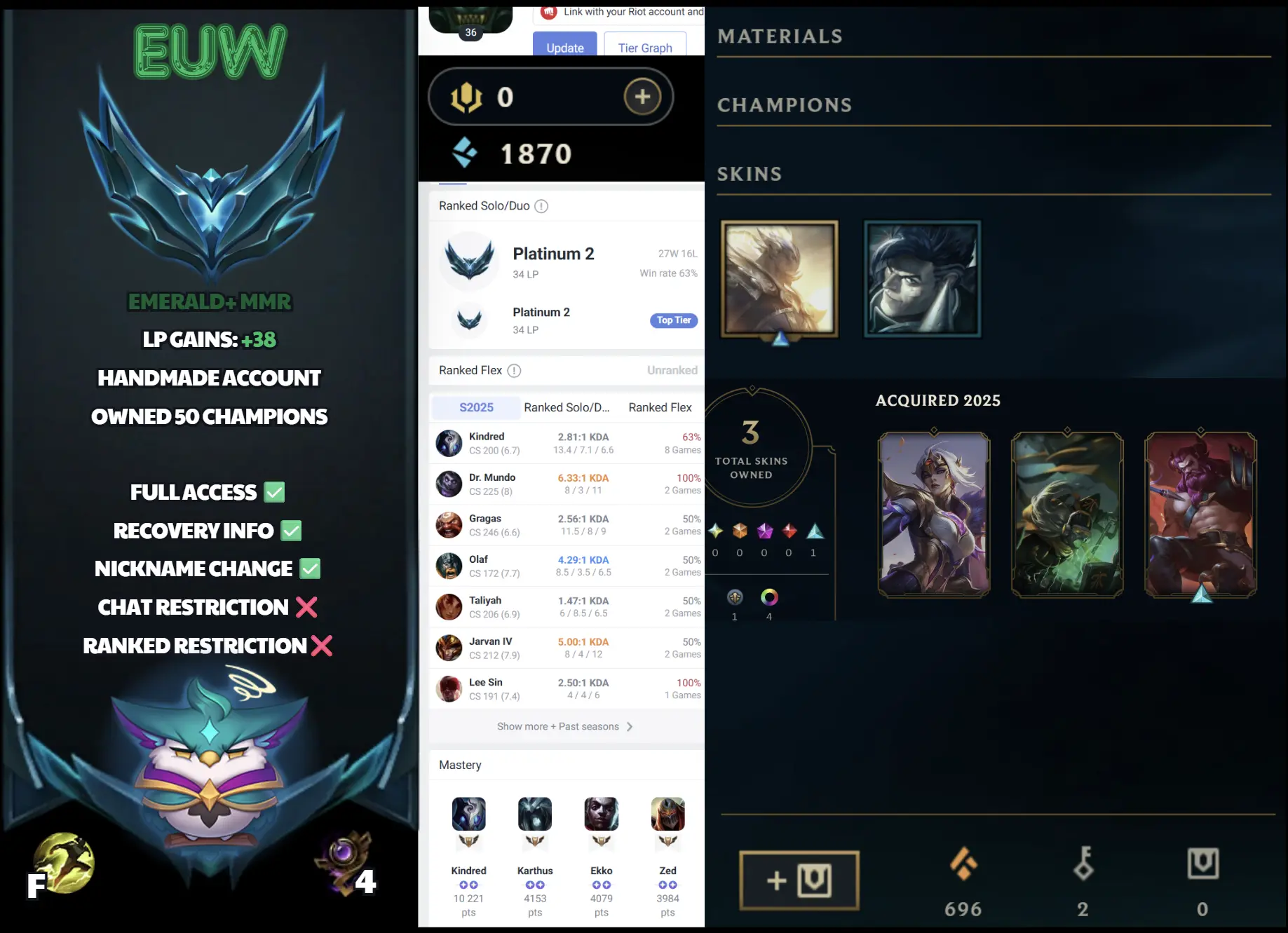 ๐ EUW ๐ Handlevel โก Platinum II (34 LP) โจ WR:63% ๐ฅ +38LP Gains โพ๏ธ Lifetime Ownership ๐ง Full Access Account โ