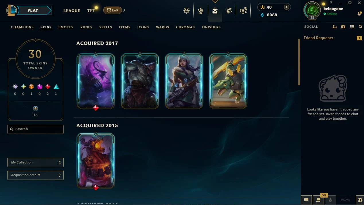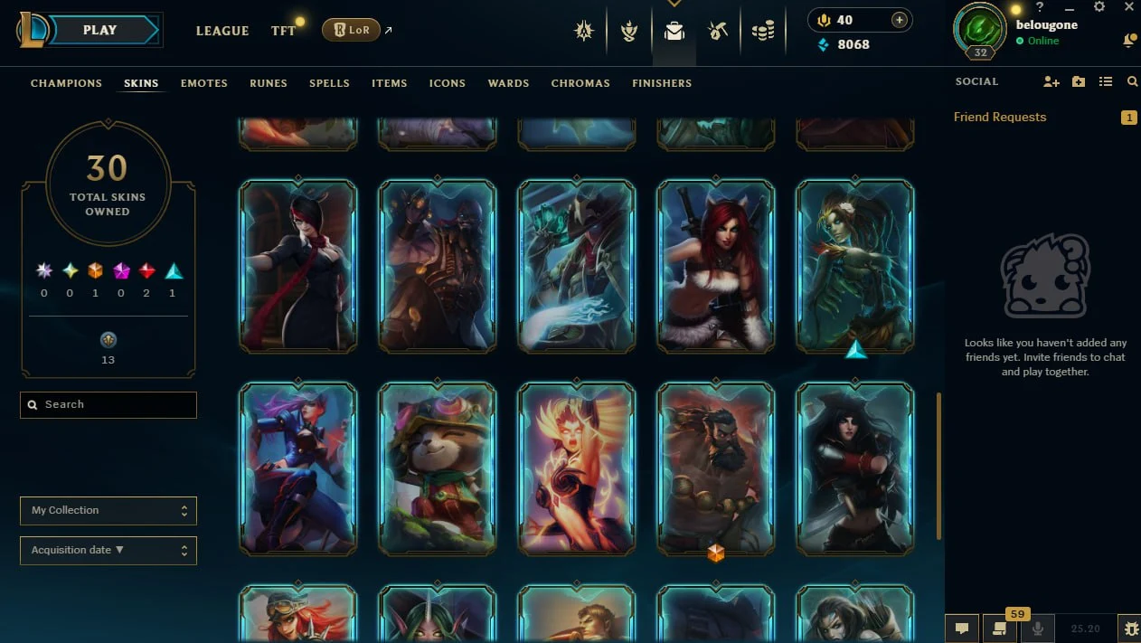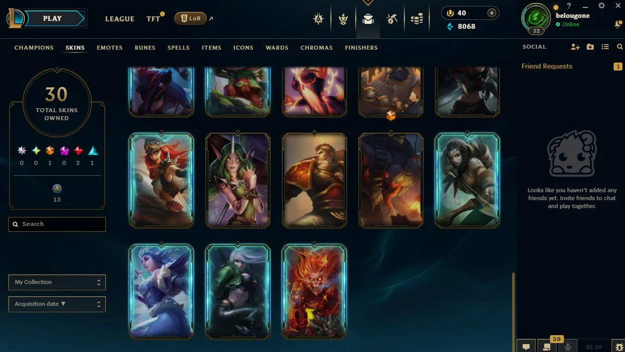 [EUW] ⸱ LEVEL 32 ⸱ UNRANKED ⸱ 30 SKINS [ 8068 BE , 40 RP ] ⸱ 44 CHAMP