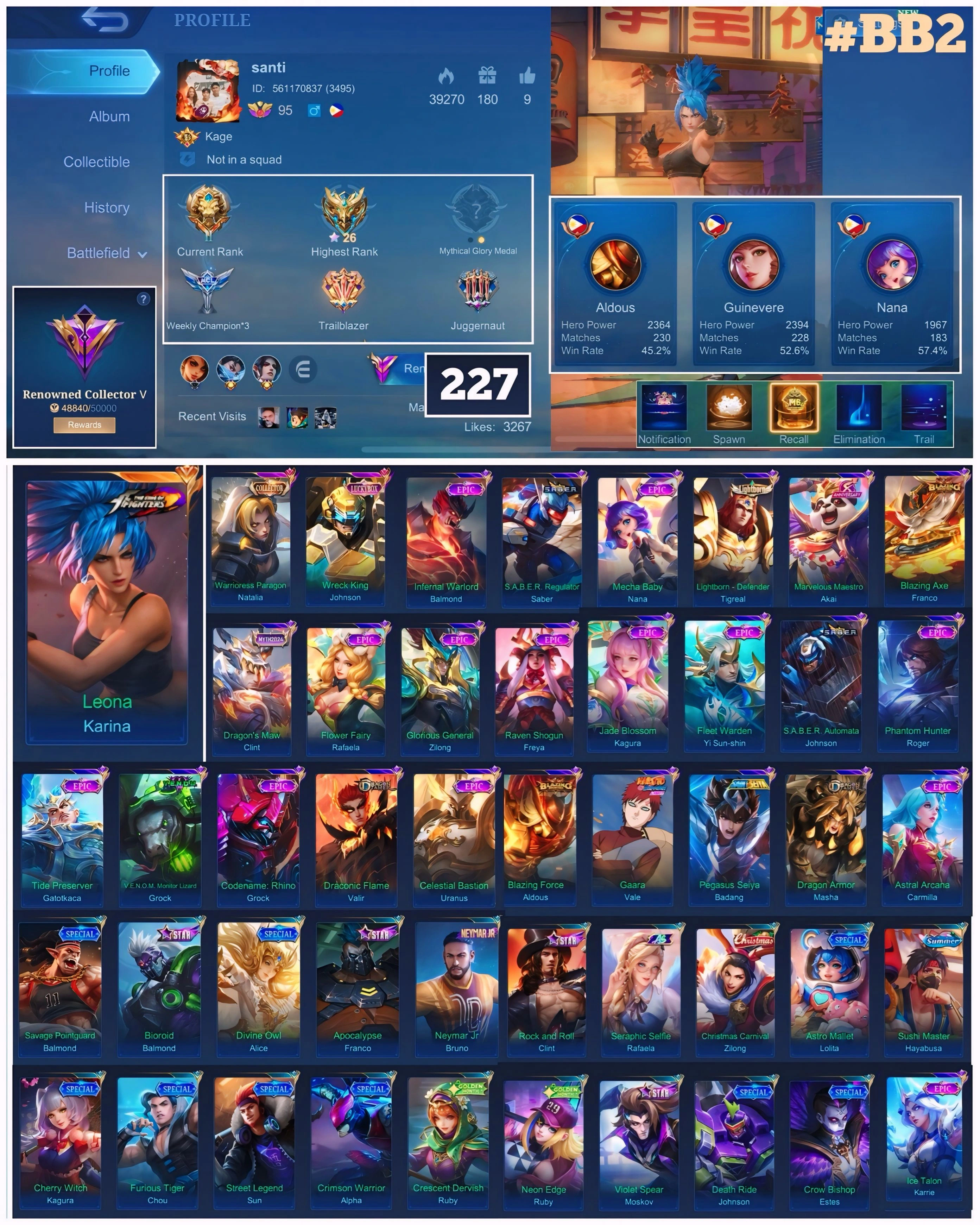 BB2💎Skin 227💎Hero 129💎Kof Karina💎 Collector Natalia💎Luckybox Johnson💎13 Epic💎Lightborn Tigreal💎Blaz Franco Aldous💎Myth Clint💎Venom Grock💎Dragon Valir Masha💎Naruto Vale💎Seint Badang💎