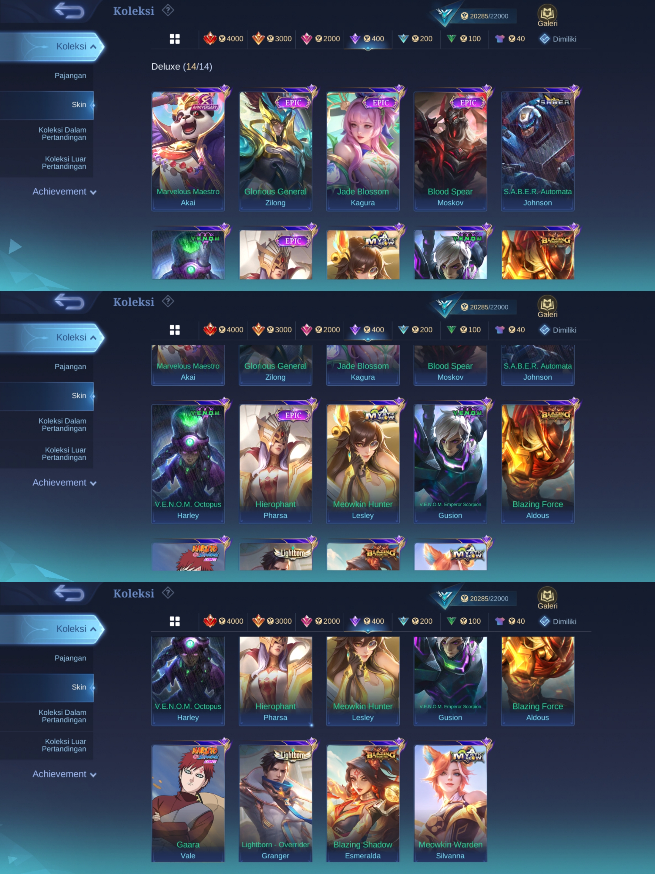 BEST MEGA DEAL✨HERO 91✨SKIN 112✨EMBLEM SEMIMAX✨ HIEROPHANT PHARSA✨KAGURA JADE BLOSOM ✨BLAZING ALDOUS✨ESME BLAZING ✨VALE ARUTO ✨JHONSON S.A.B.E.R✨HARLEY VENOM✨SILVANA MYSTIC✨SPECIAL 13✨SAFE ACC✨INSTAN DELIVERY