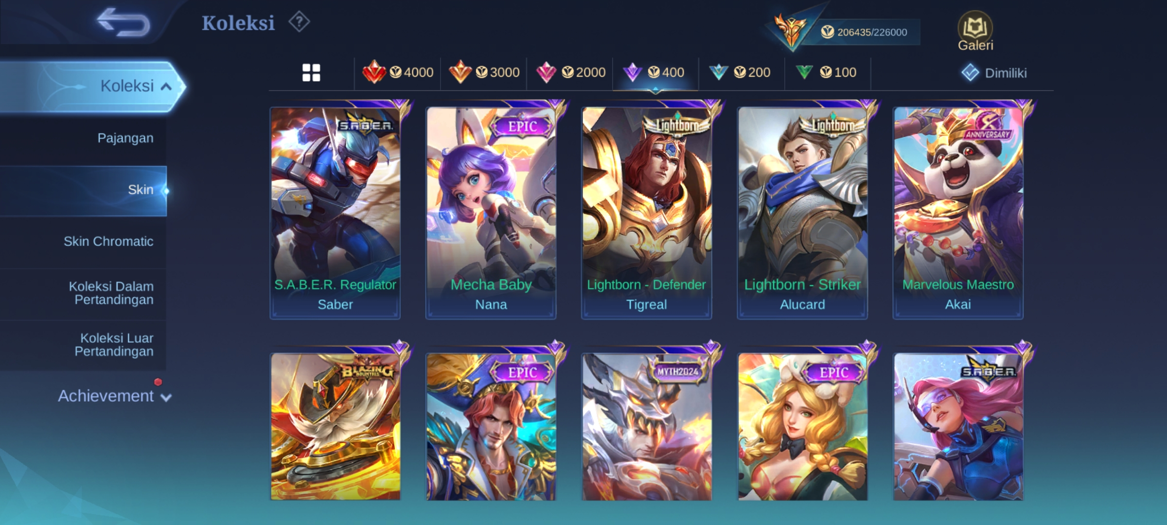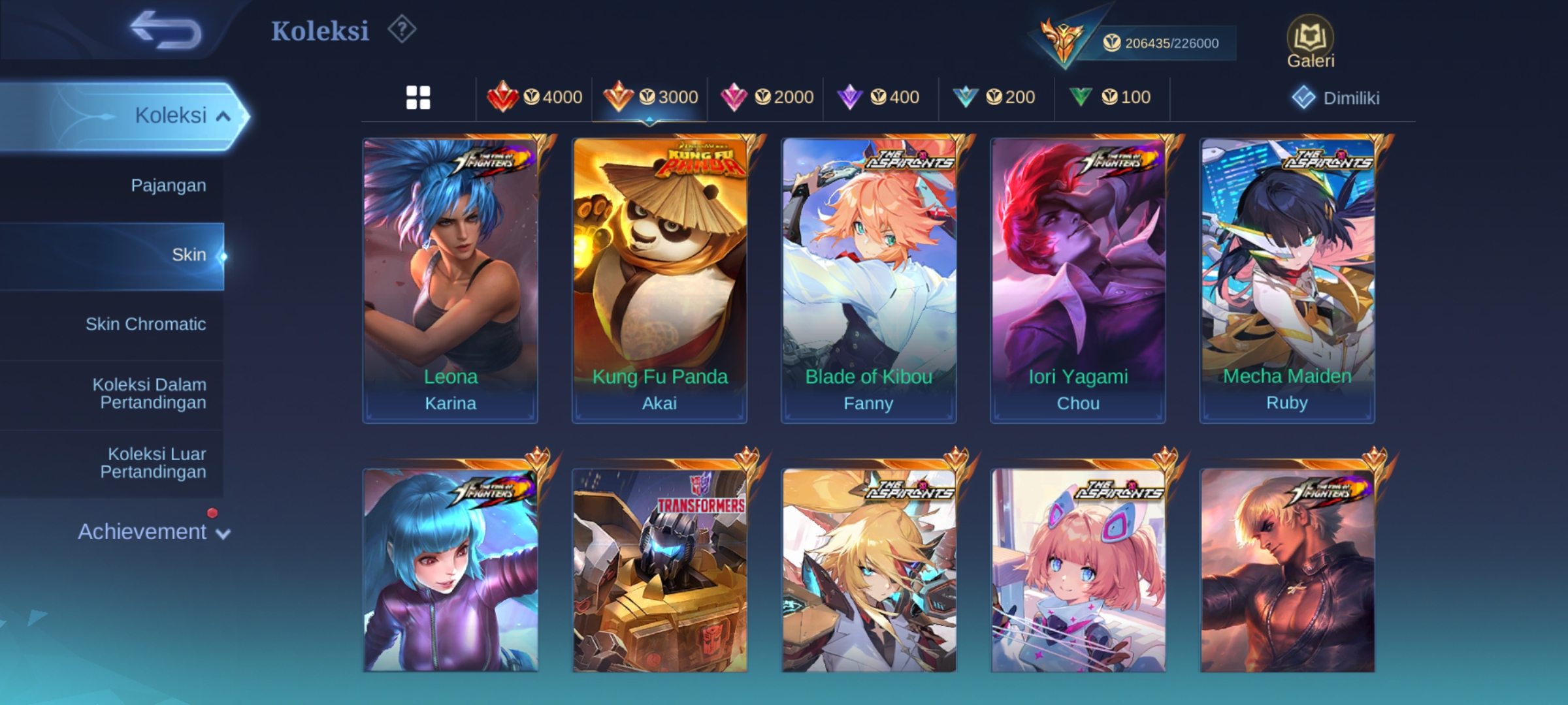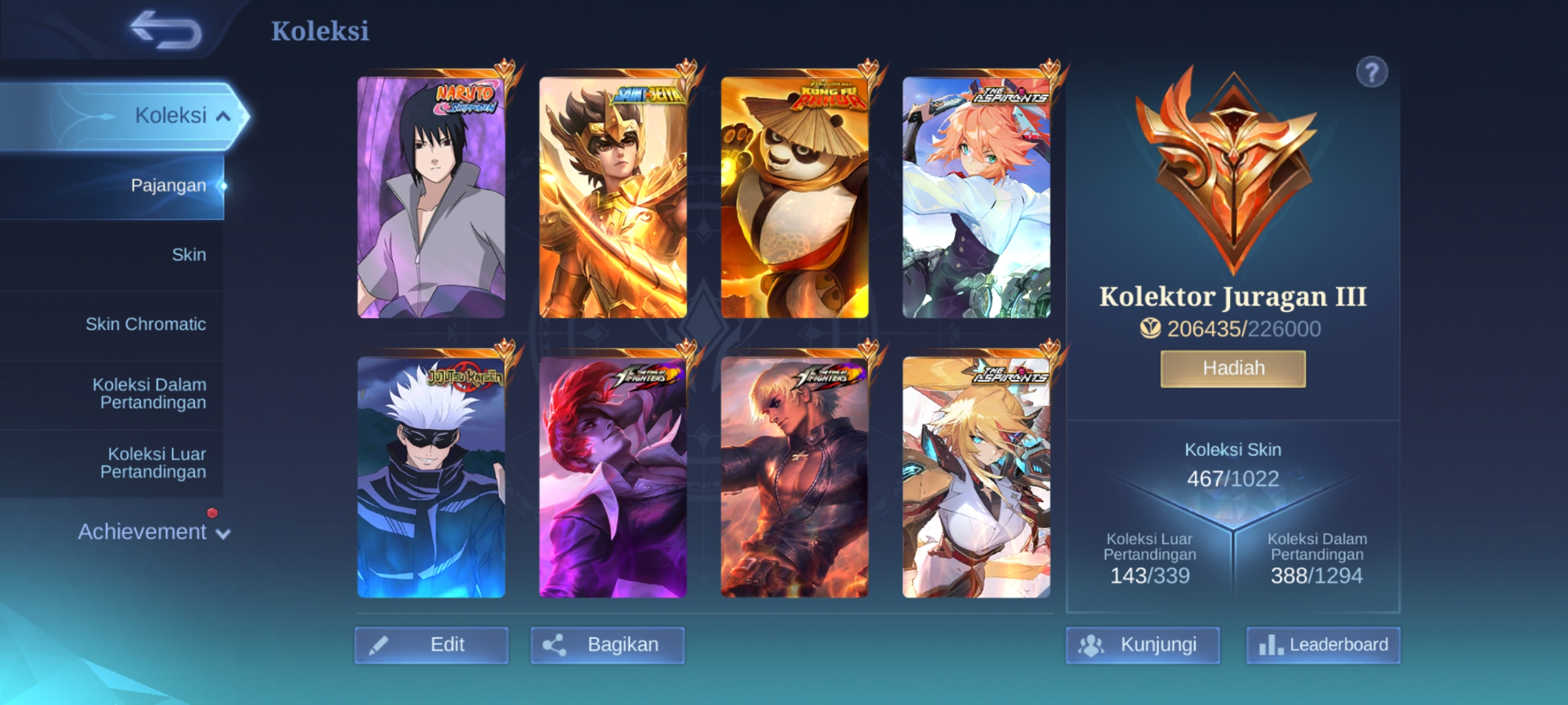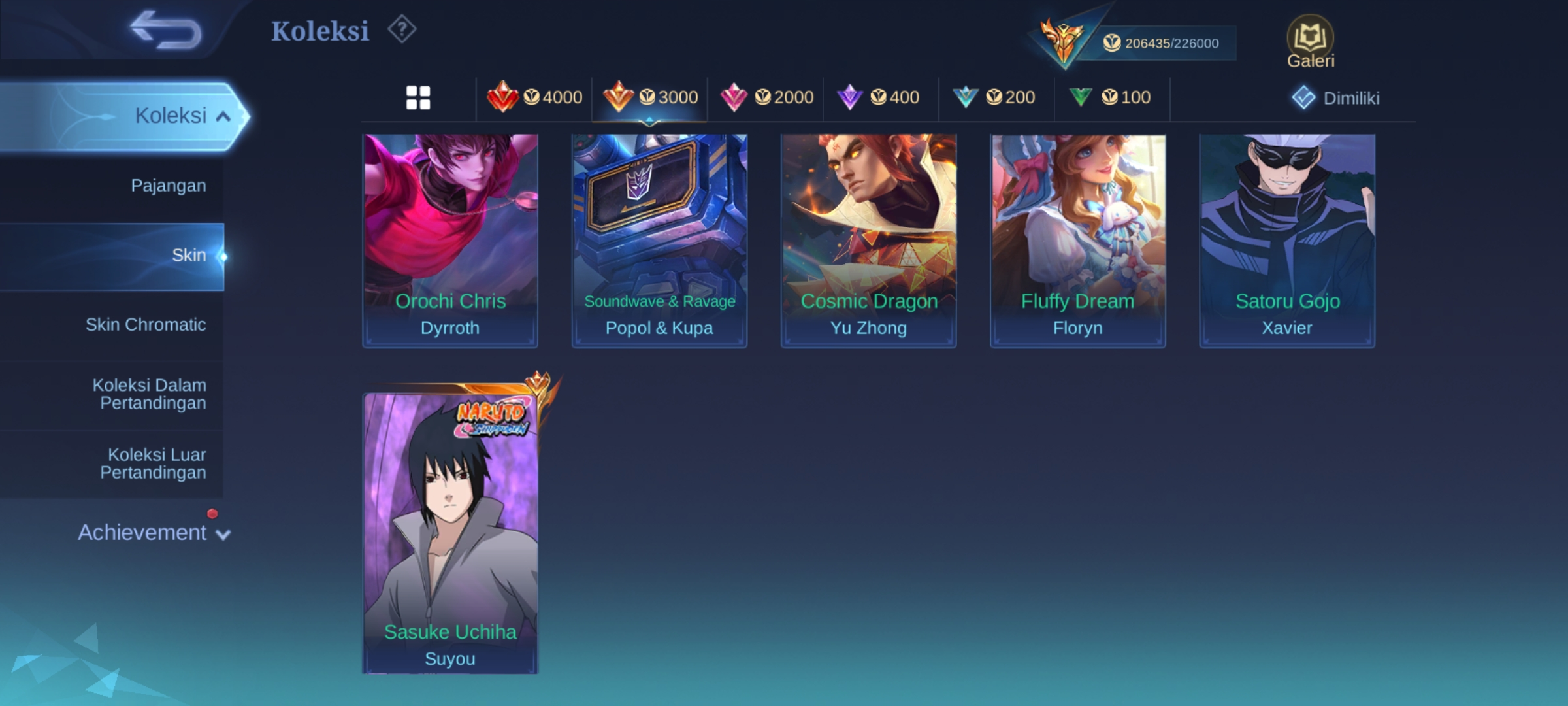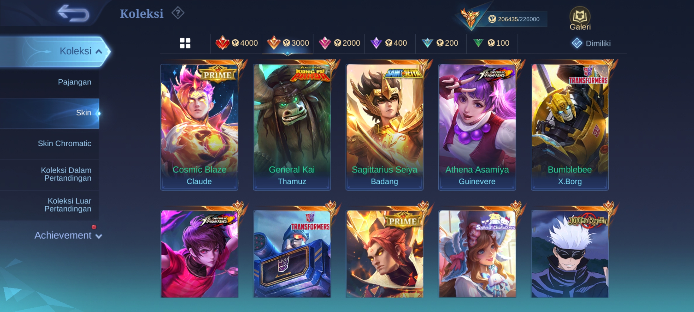 ML-375 Skins 467 [ 3 Legend ] Sasuke Suyou / Jjk Gojo / Saint Seiya Badang / 4 Aspirants / 6 KOF / 2 Kungfu / 3 TF / 3 Collector