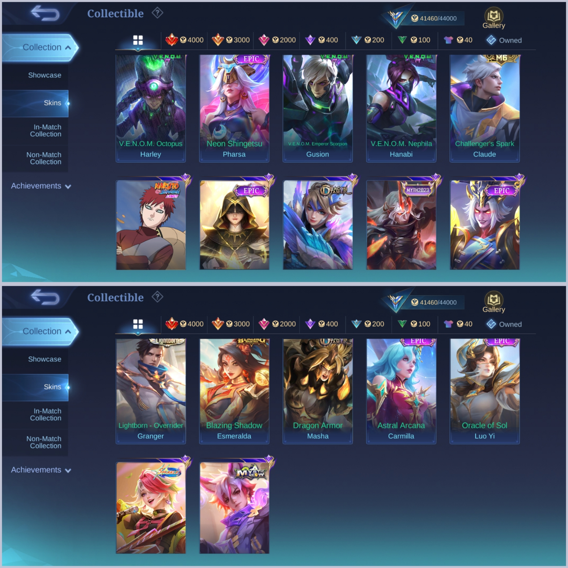 ML287✨HERO 91✨SKIN 166✨EMBLEM MAX✨RECAL EPIC✨KOF KARINA✨CC NATALIA✨STAR LESLEY✨SPARKLE MELISA✨VENOM 3✨EPIC 10✨STAR 4✨BLAZING 2✨DT 2✨SPECIAL 22✨HALOWEEN 2✨SUMMER 2✨M6 CLAUDE✨LUNAR SUN✨LIGHBORN GRANGER