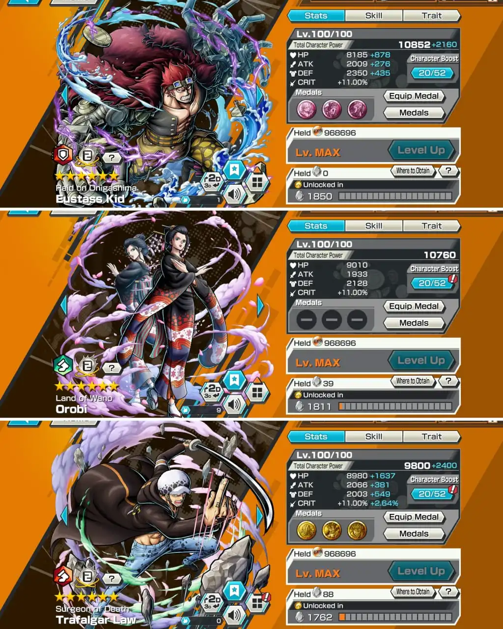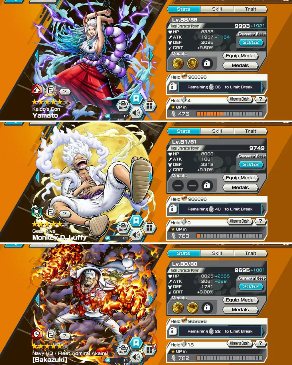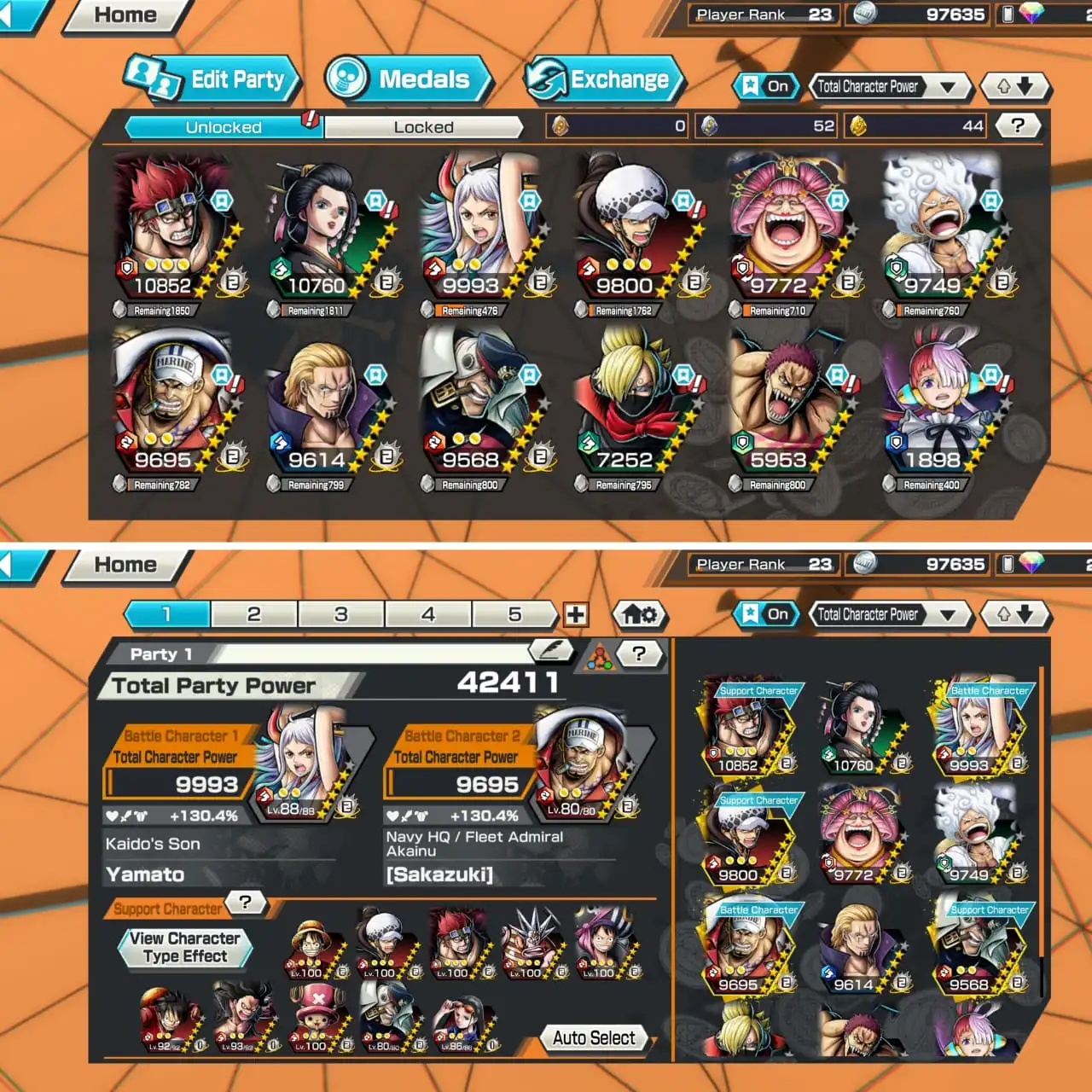 OP190✨4 EXTREME✨LUFFY,YAMATO,AKAINU,BIGMOM✨SUPPORT 130%✨LAW,EUSTAS,OROBI MAX✨GOOD MEDALS✨MANY CHARACTER✨ANDROID/IOS