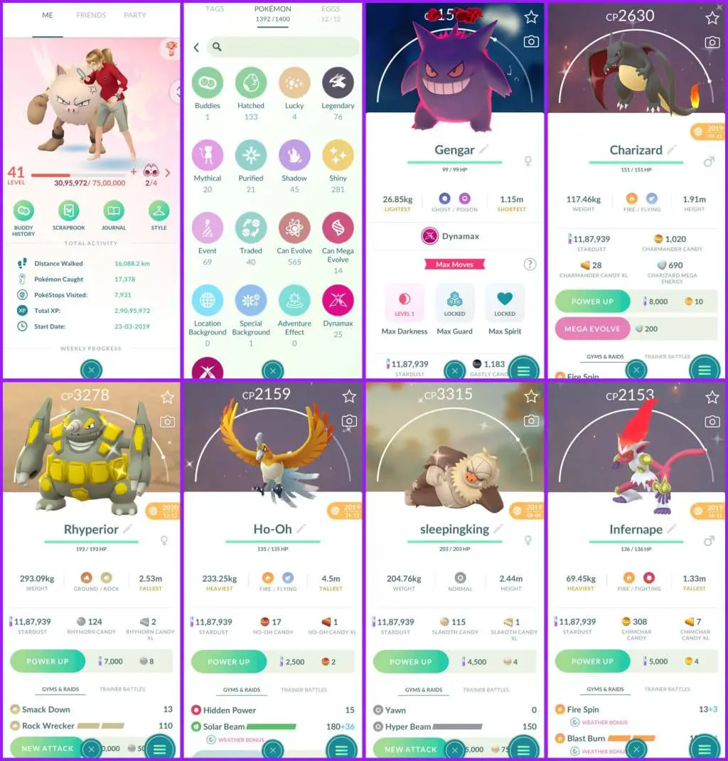 LEVEL 41(VALOR)🔥1392/1400 Pokemon🔥281 Shiny🔥76 Legendary🔥Shiny Charizard🔥D-Max Gengar🔥1187939 Stardust🔥822/950 Items🔥Instant Delivery