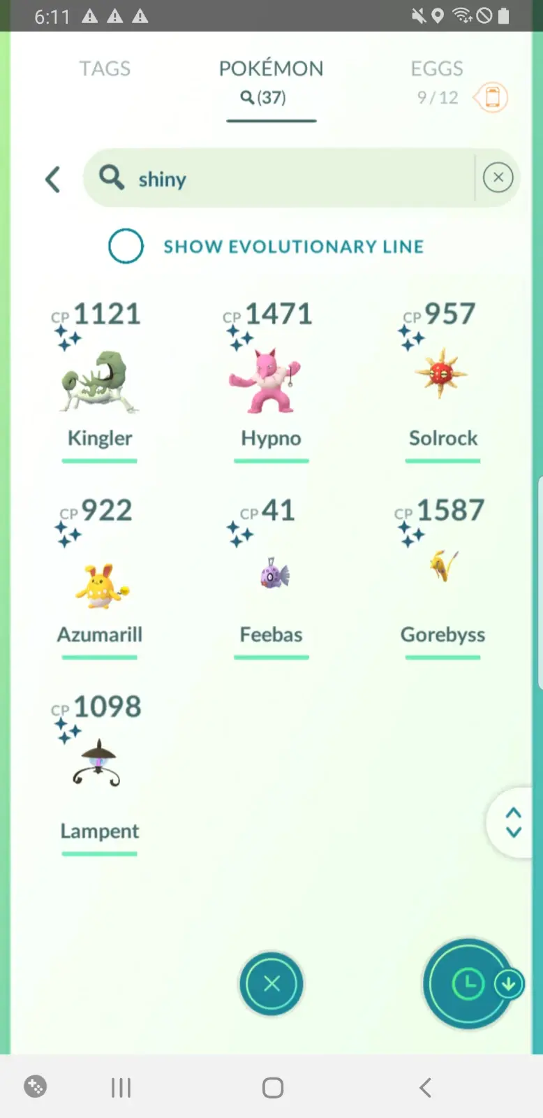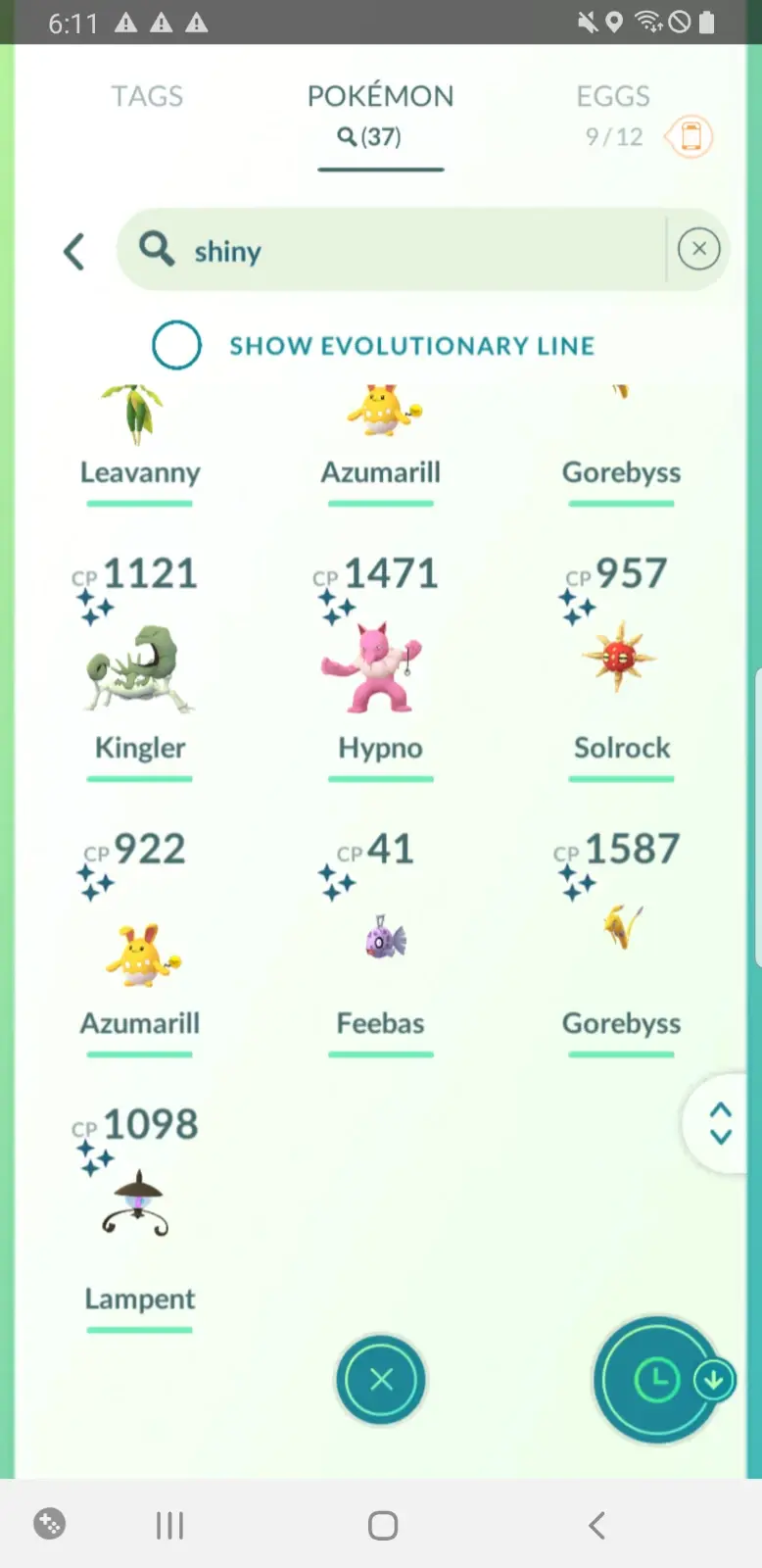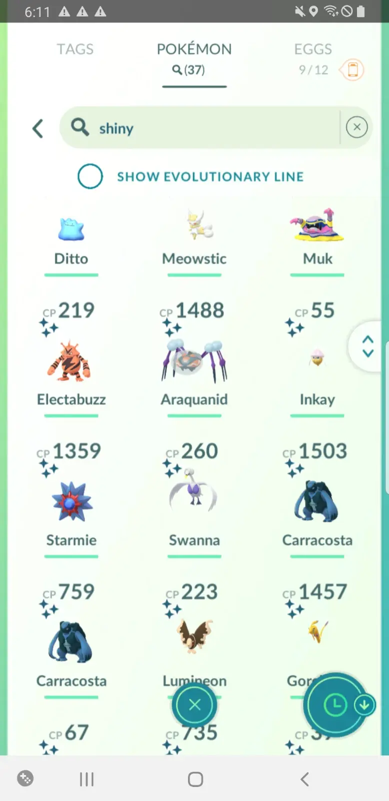 Shiny Pokémon: Gorebyss, Gorebyss, Carracosta, Meowstic, Gorebyss, Hypno, Azumarill, Gorebyss, Starmie, Araquanid, Blastoise, Eelektrik, Salandit, Huntail, Lumineon, Kingler, Crustle, Lampent, Azumarill, Garbodor, Solrock, Muk, Azumarill, Leavanny, Carracosta, Starmie, Inkay, Charjabug, Meowstic, Swanna, Lumineon, Electabuzz, Ditto, Feebas, Feebas, Pansage, Muk