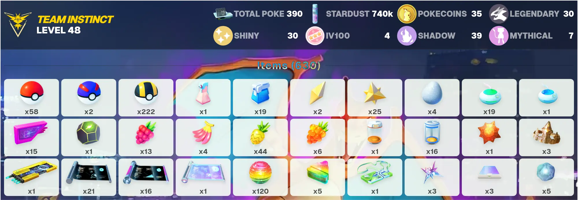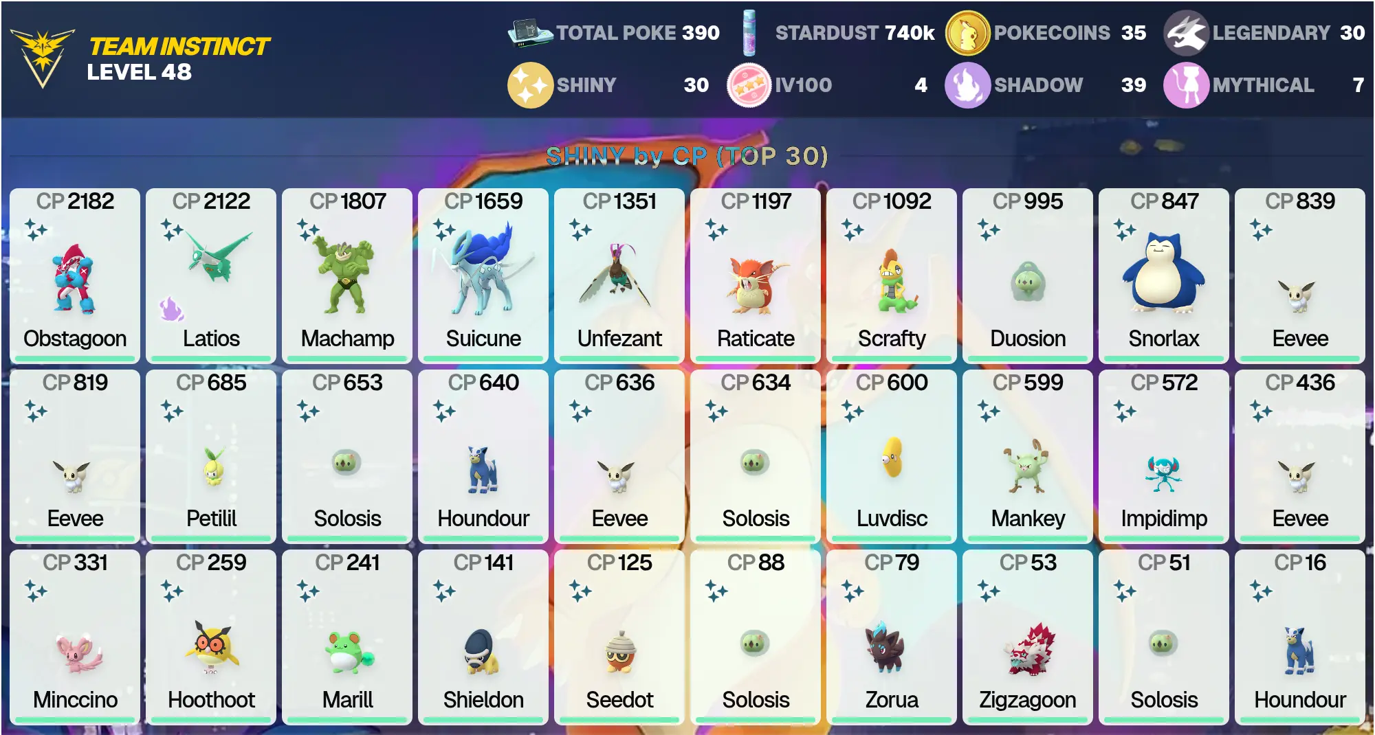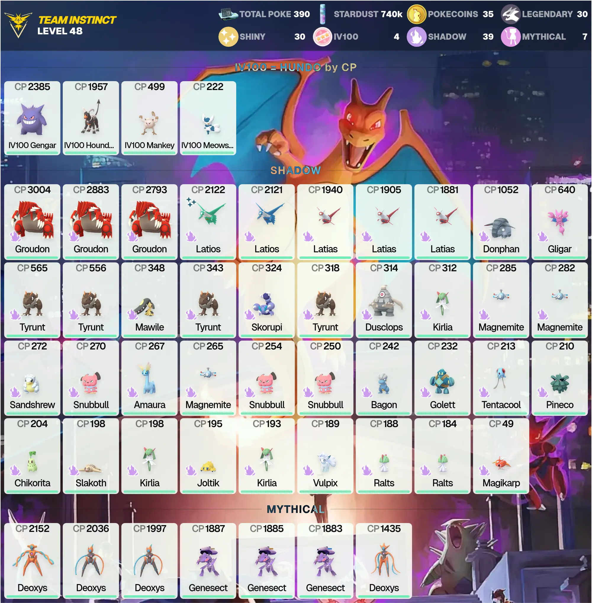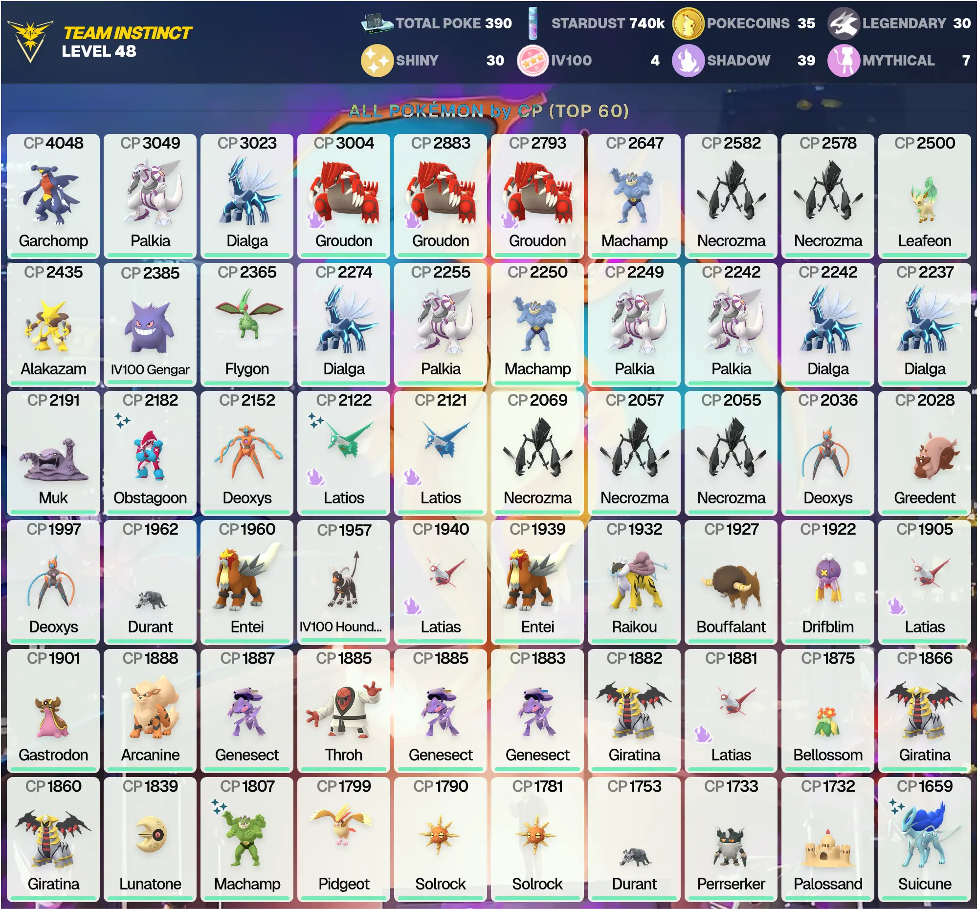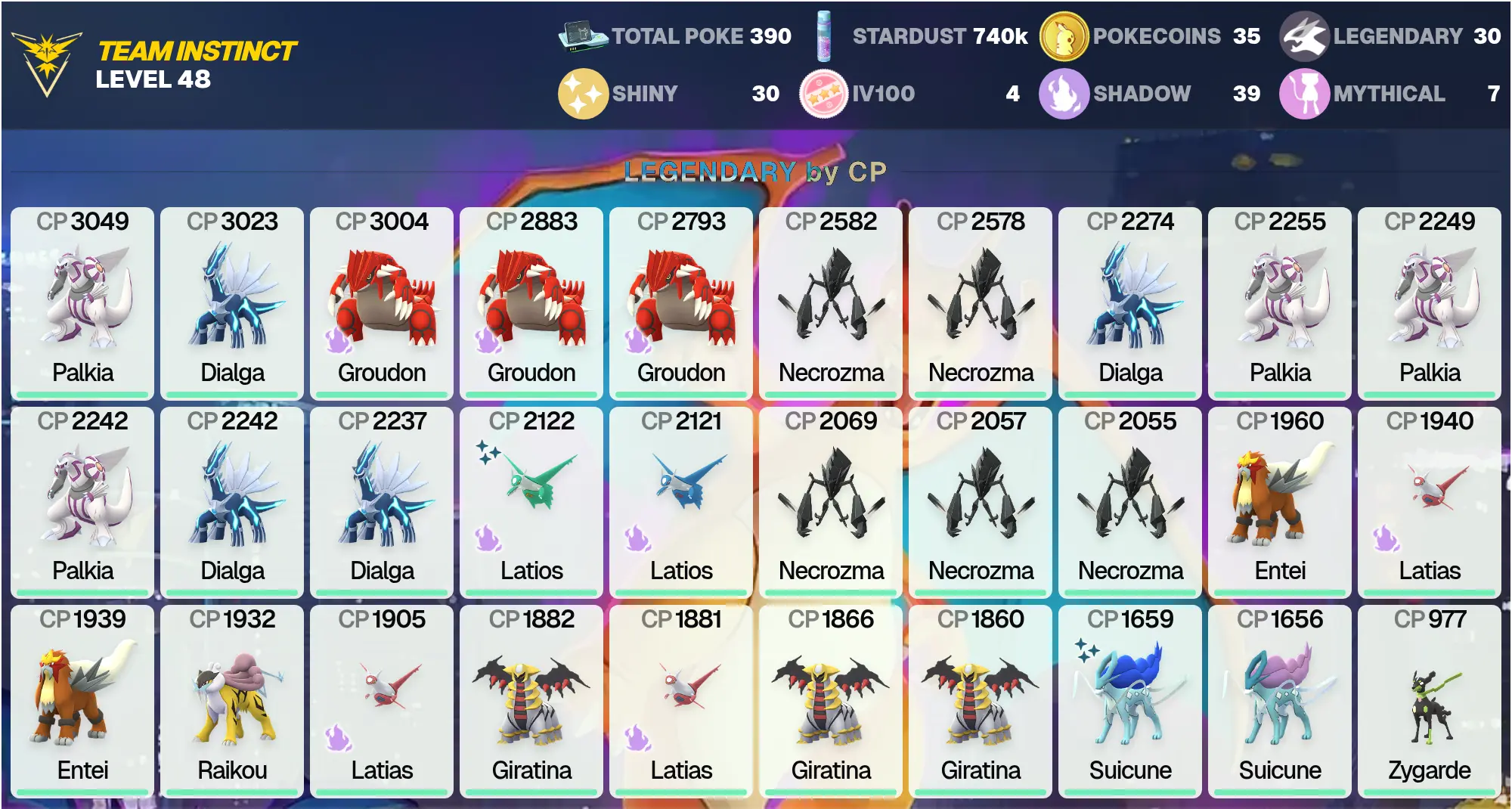👑 POGO 🏆 30 Legendary ✨ 30 Shiny 💗 Shiny Latios 🌊 Shiny Suicune 🐉 Dialga 3K 🌊 Palkia 3K 🐲 Garchomp 4K 👻 Giratina 🌑 Shadow Groudon 3K 🏷️ [MG] 🔐 PG-PXABG !MKG016004