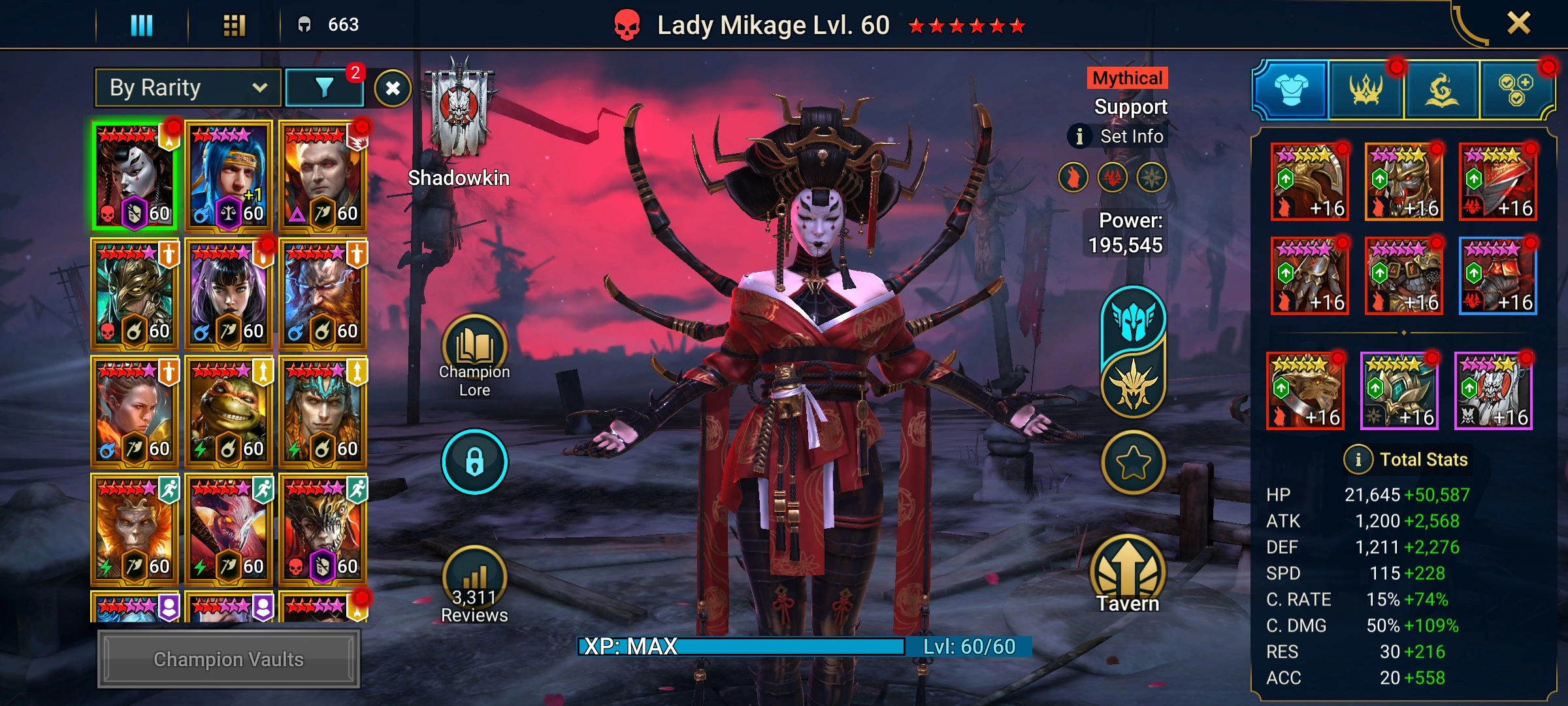 [1 Mythical Champions][10.36M] Lady Mikage(6*) + 125 LEGENDARY (Siphi,Riho,Baron,Yakarl x2,Harima,Thor(5*)/x2,Pythion x2,Falmond,Elva x2,Shyek+Krokhad,Fabian,Praeva,Teodor,Ragash,Razelvarg,Brogni...) + 1k UNM + 6112 gems + Embrys 94/100