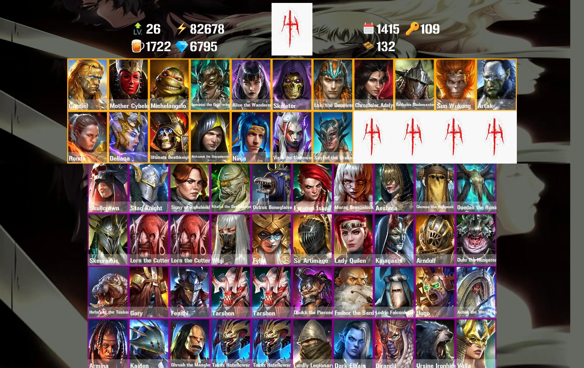 1415 Days 82.7k Energy Cardiel ⸱ Mother Cybele ⸱ Michelangelo ⸱ Leminisi the Gold-wing ⸱ Alice the Wanderer ⸱ Skullcrown ⸱ Stag Knight ⸱ 50.6m Silver ⸱ 6.8k Gems