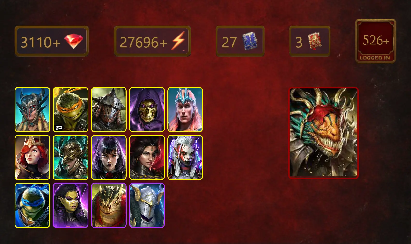 [STARTER]Lazarius+Leonardo+Scyl+Michelangelo+Rathalos+Skeletor+Loki+Lyssandra+Leminisi the Gold-Wing+Alice+Adelyn+Visix+29Epics
