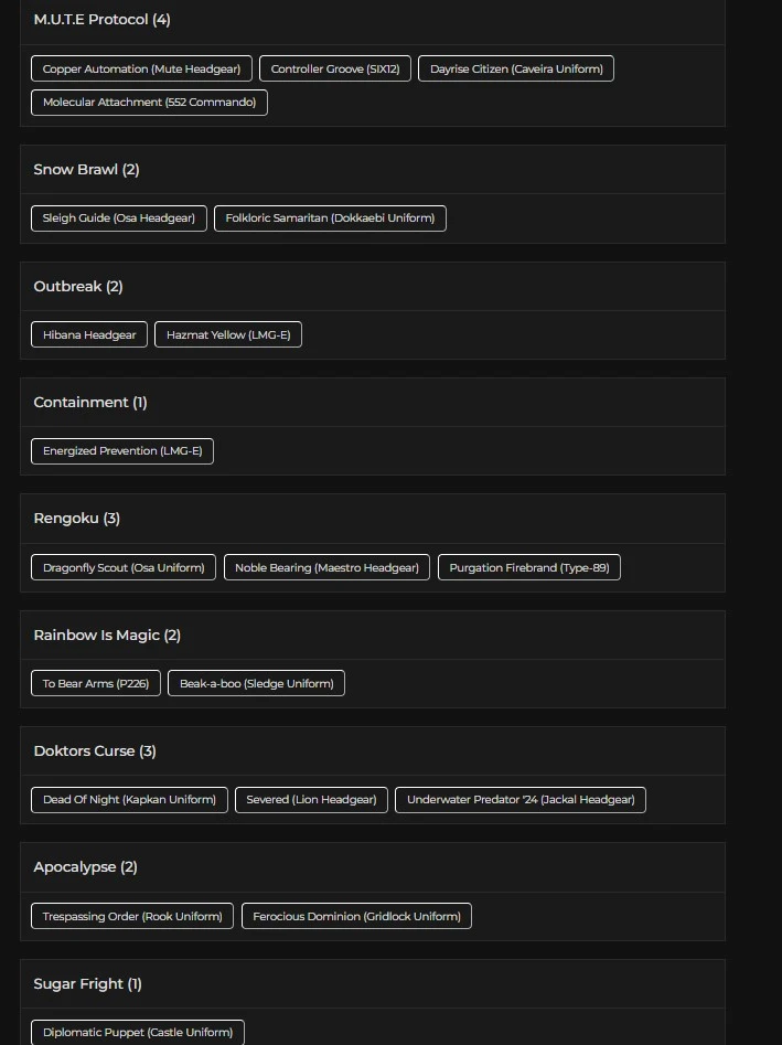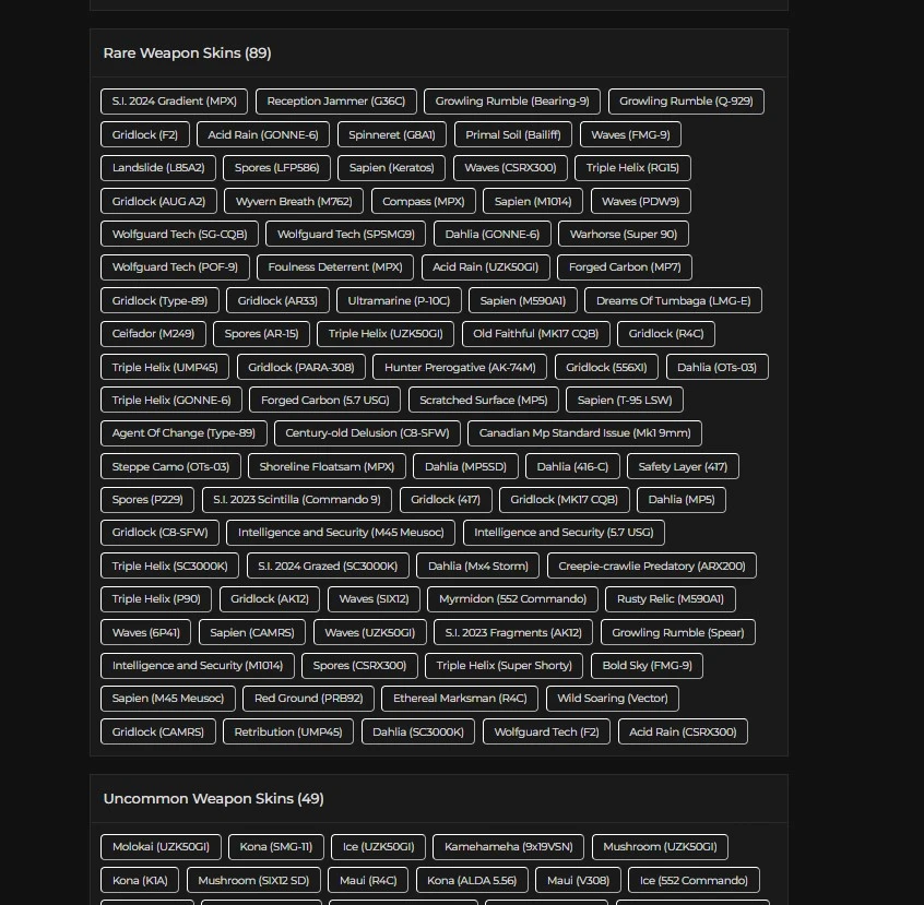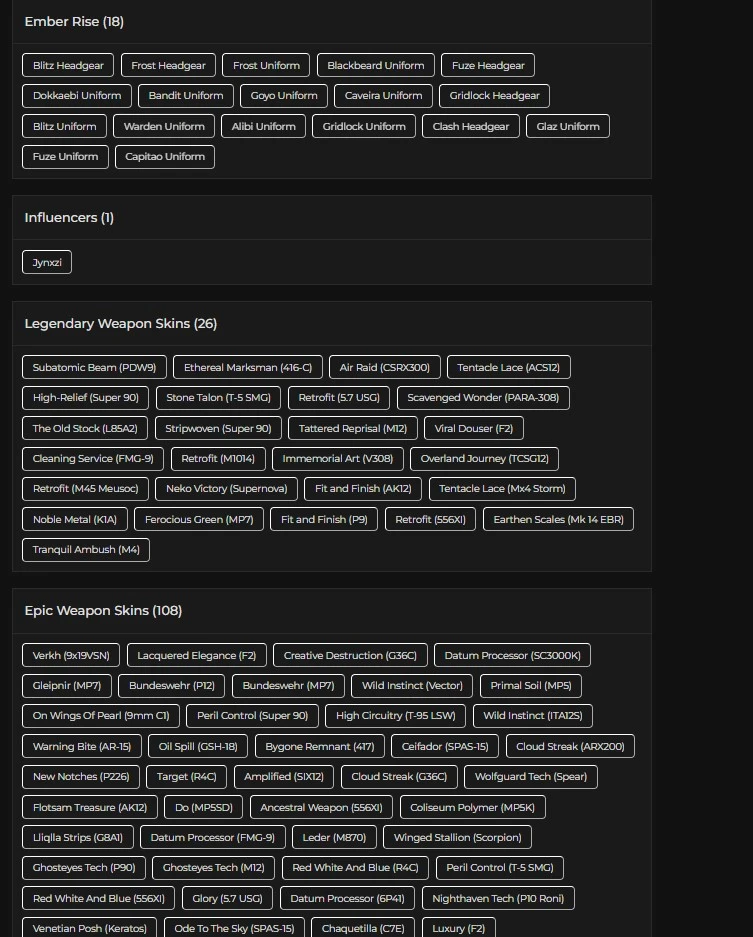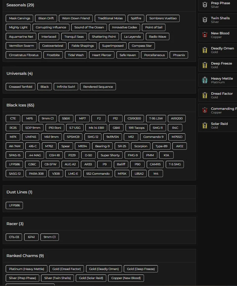 186 LVL ⸱ 65X BLACK ICES ⸱ 29X SEASONALS ⸱ 36X ELITES ⸱ 4X UNIVERSALS ⸱ 3X RACER ⸱ 74 OPERATORS ⸱ 3K RC ⸱ 143K RENOWN ⸱ FA