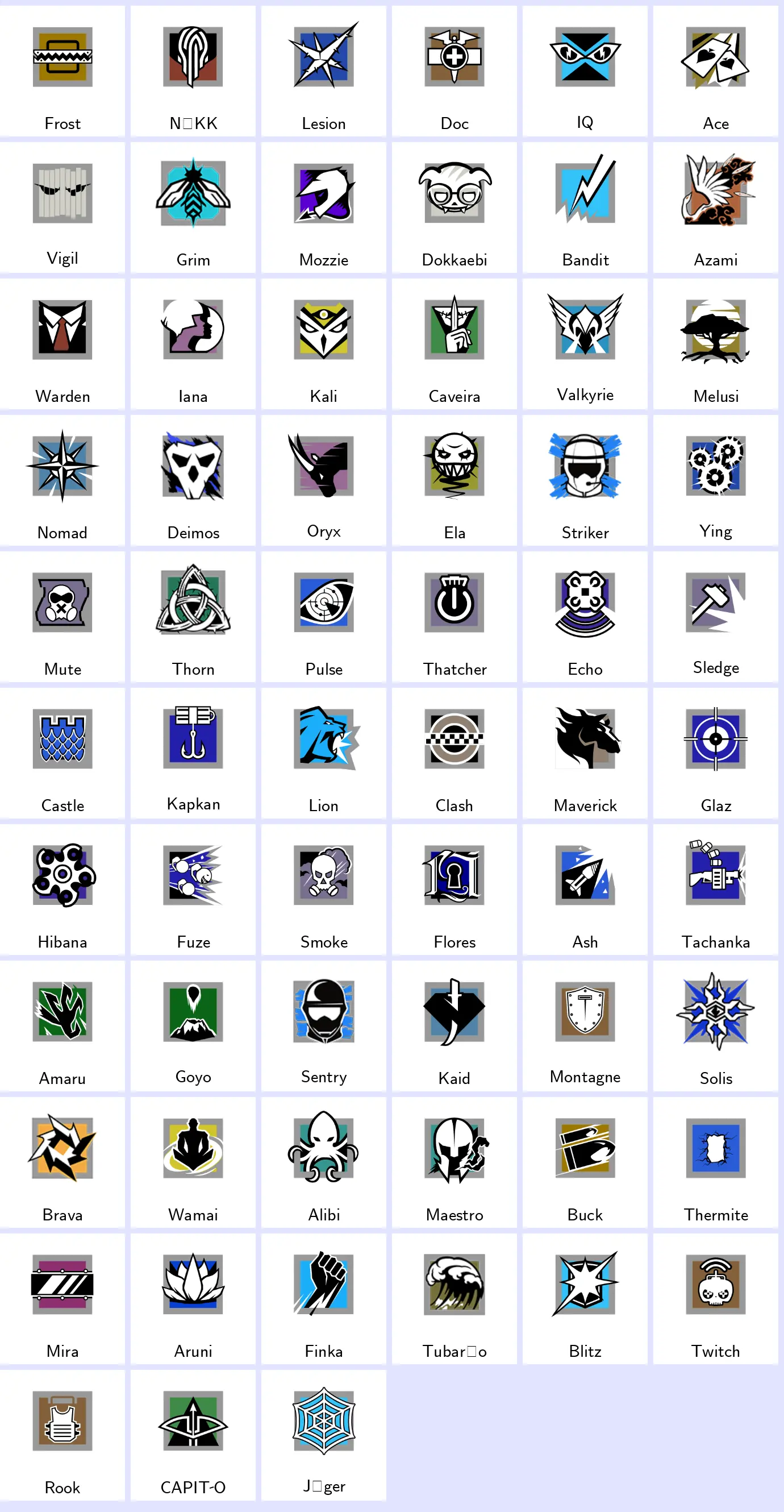 Some Operators: Frost, Nokk, Lesion, Doc, Iq, Ace, Vigil, Grim, Mozzie, Dokkaebi...