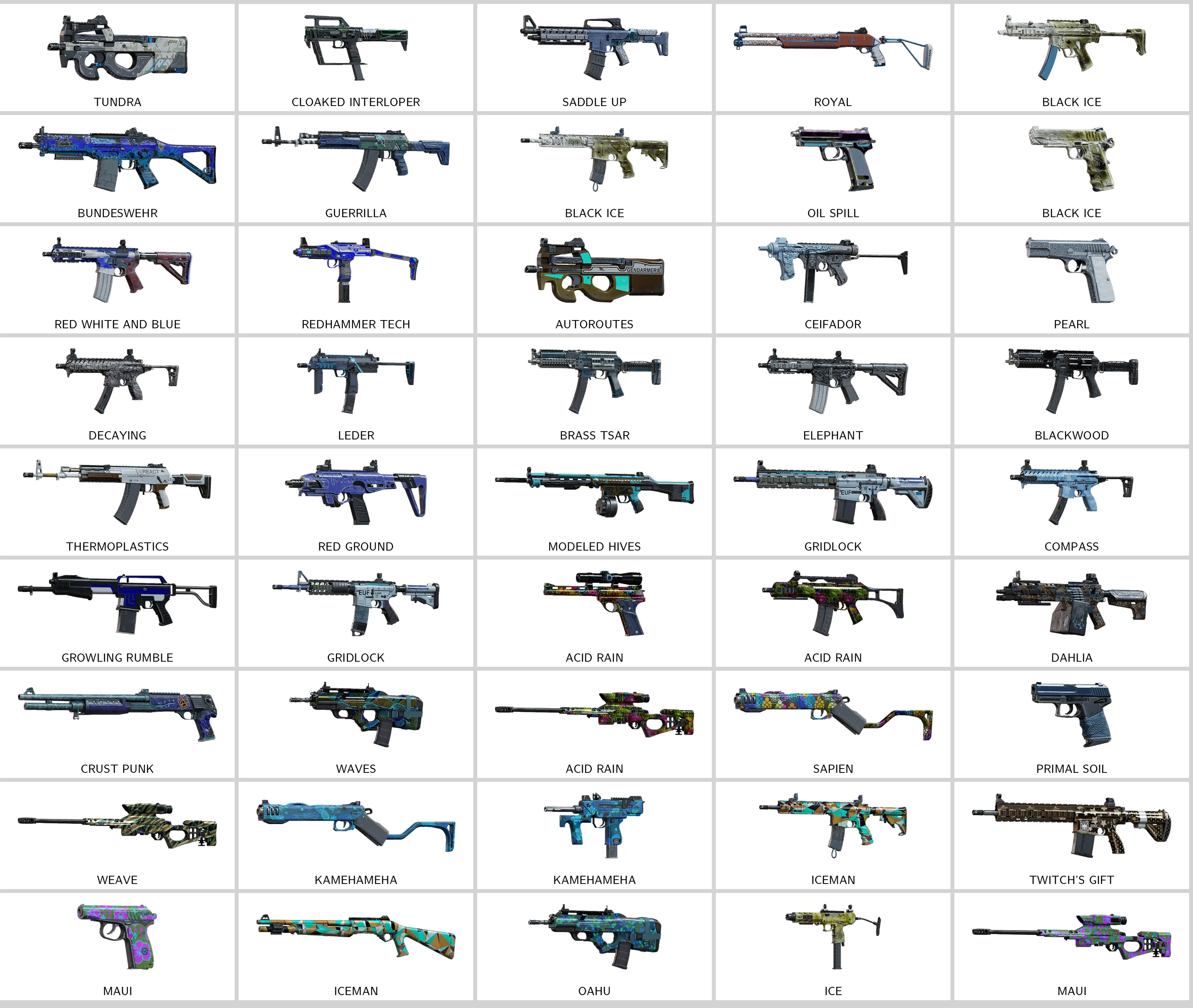 - Tundra (P90), Ethereal Marksman (416-C), Metallurgic Burn (9mm C1), Stone Talon (T-5 SMG), Saddle Up (TCSG12), Viral Douser (F2)...