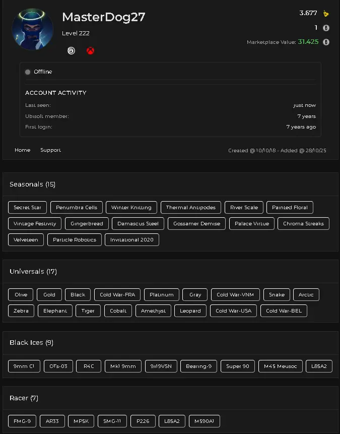 ⭐[PSN LINKABLE]⭐Level 222✅16 Pro League Old🎨17 Universal Skin🌸15 Seasonals Skin❄️9 Black Ice👑66 Operators🔥440 Weapon Skin⚜️13 Elite💫7 Racer