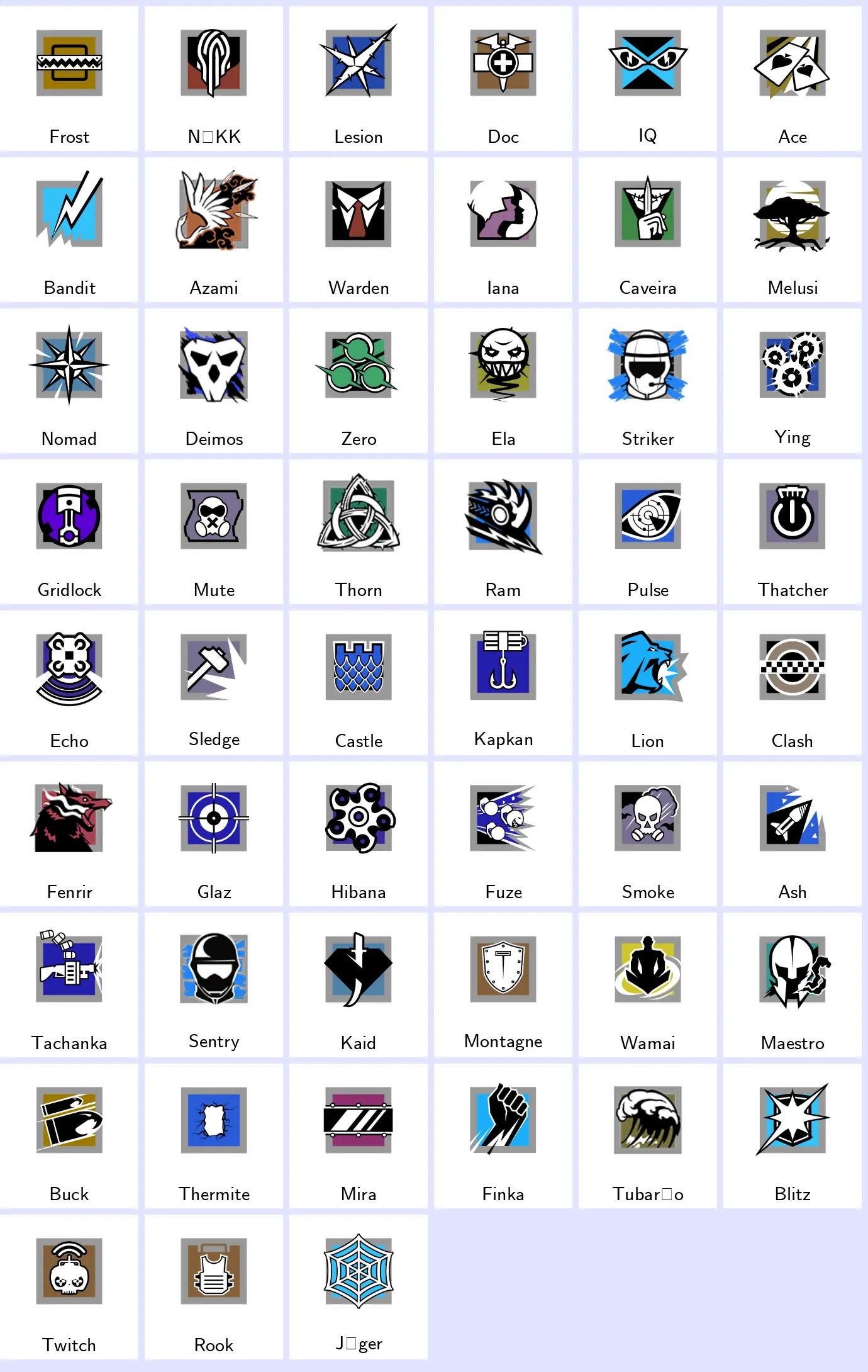 Some Operators: Frost, Nokk, Lesion, Doc, Iq, Ace, Bandit, Azami, Warden, Iana...
