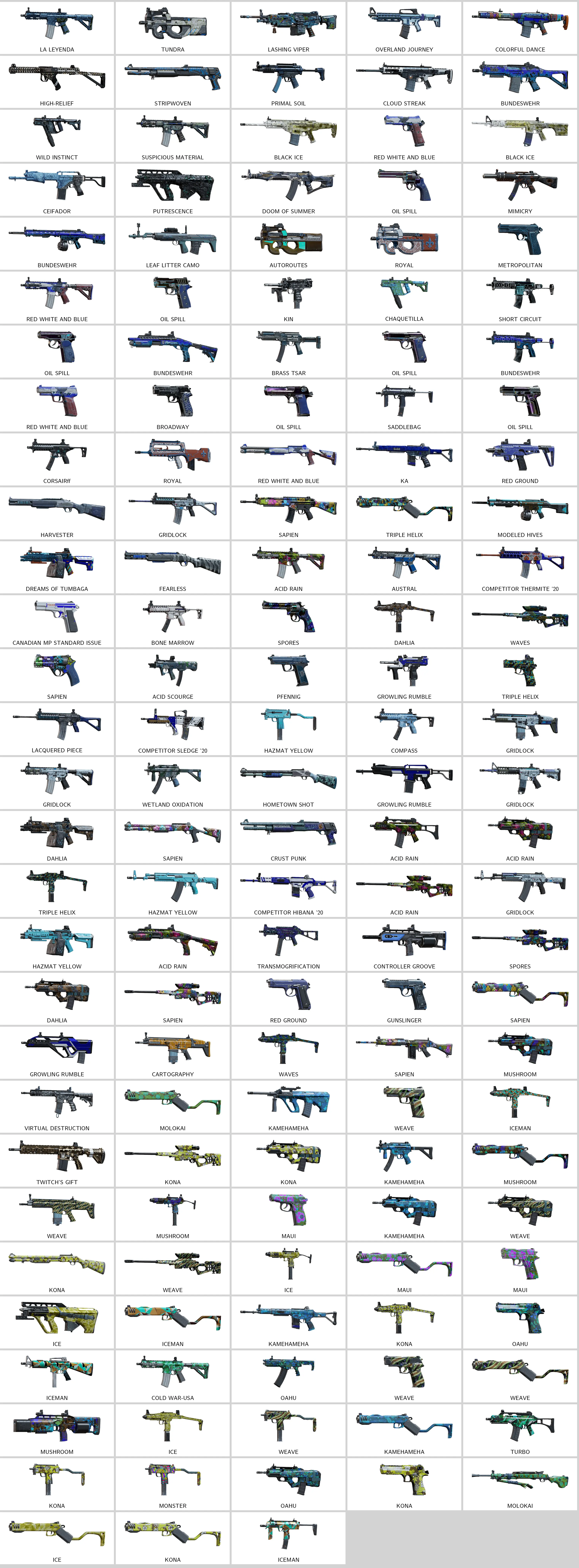 - Tundra (P90), Ethereal Marksman (416-C), Arctic Range (C8-SFW), Colorful Dance (ARX200), Flight of Triumph (M12), Air Raid (CSRX300)...