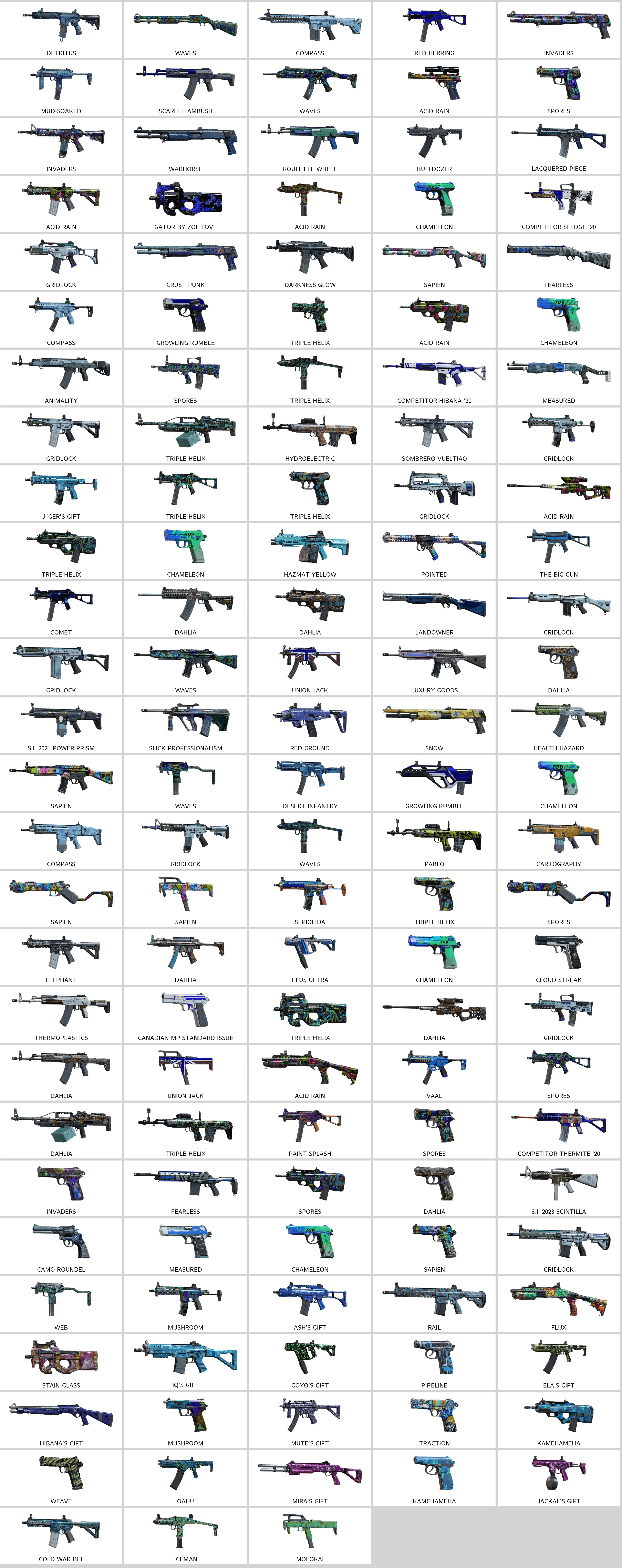 - Testing Prop (K1A), Hot Chopper (556XI), Experimental Unit (P90), Mythical Majesty (AK-74M), Coil Widget (M762), Metal Typhoon (Bearing-9)...