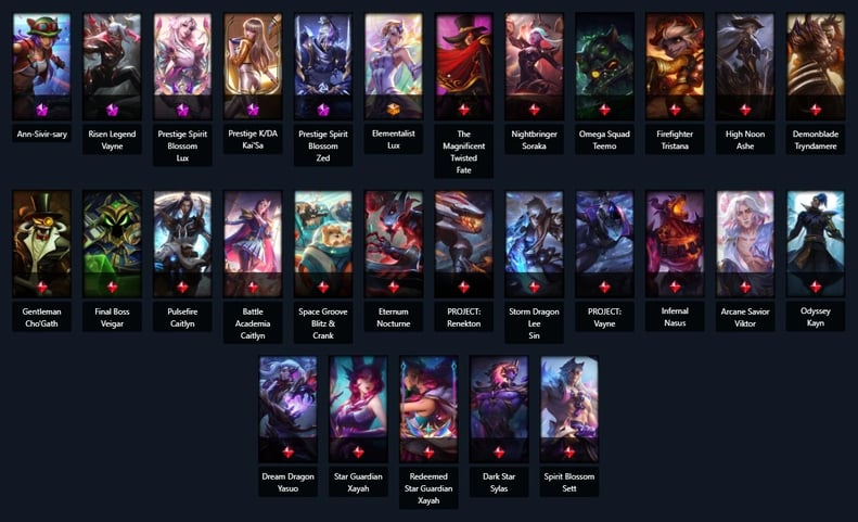 UnRanked┃428 skins┃171 Champs┃(13 Mythic) Prestige Obsidian Dragon Sett Soulstealer Vayne Prestige True Damage Senna Prestige Spirit Blossom Teemo Hextech Amumu Prestige Battle Queen Diana Prestige Porcelain Lux