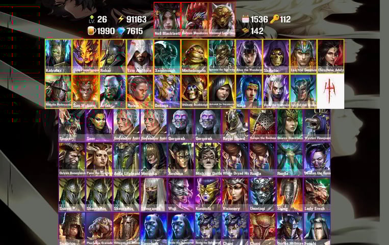 1536 Days 91.2k Energy [Mythical Starter] Nell Blackteeth ⸱ Galleus Bloodcrest ⸱ Mezomel Luperfang ⸱ Kalvalax ⸱ Sicia Flametongue ⸱ Robar ⸱ Ezio Auditore ⸱ Xenomorph ⸱ Seeker ⸱ Seer ⸱ 59.6m Silver ⸱ 7.6k Gems