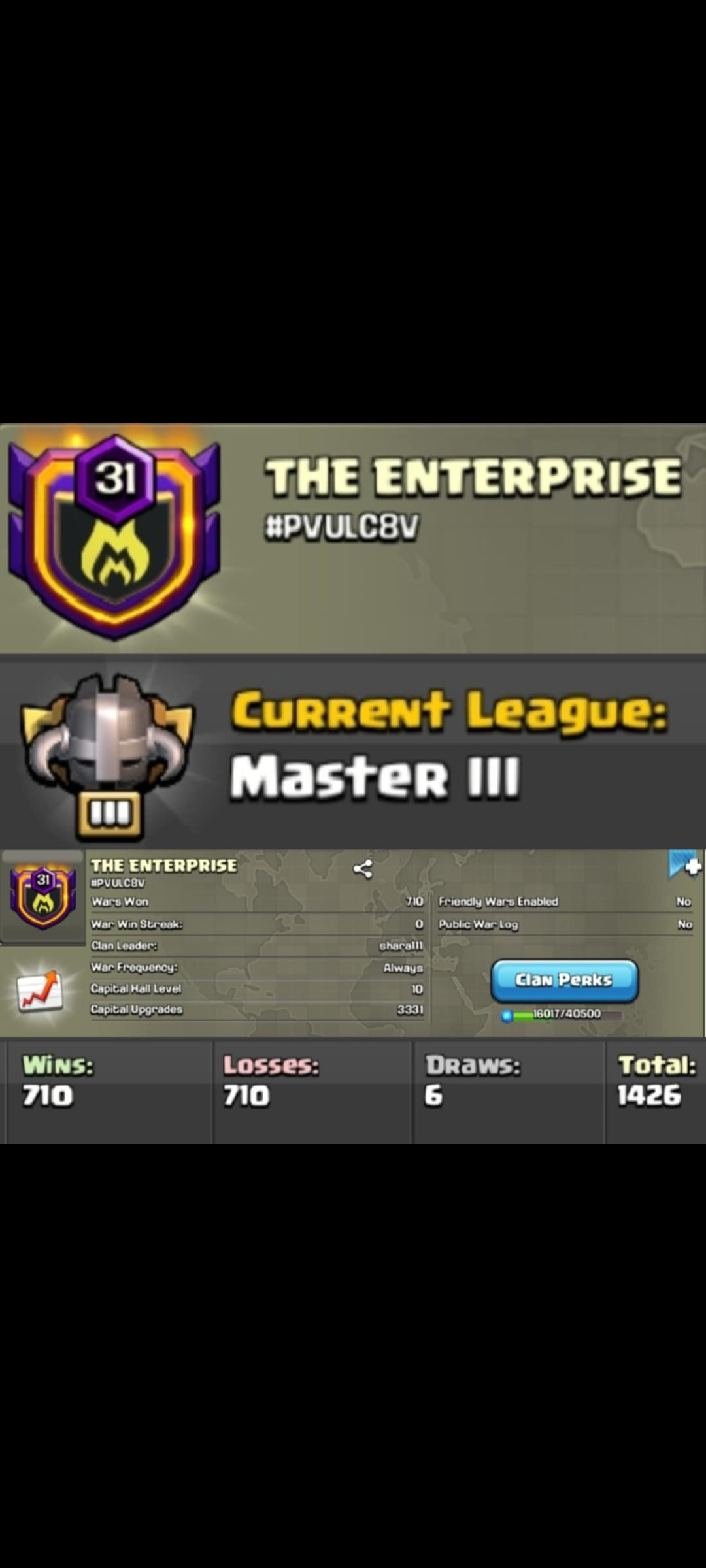 🦋LEVEL 20🦋NAME: WAR CLAN🦋CWL LEAGUE: CRYSTAL 1🦋CAPITAL HALL LEVEL: 10🦋BEST WAR LOG🦋INSTANT DELIVERY