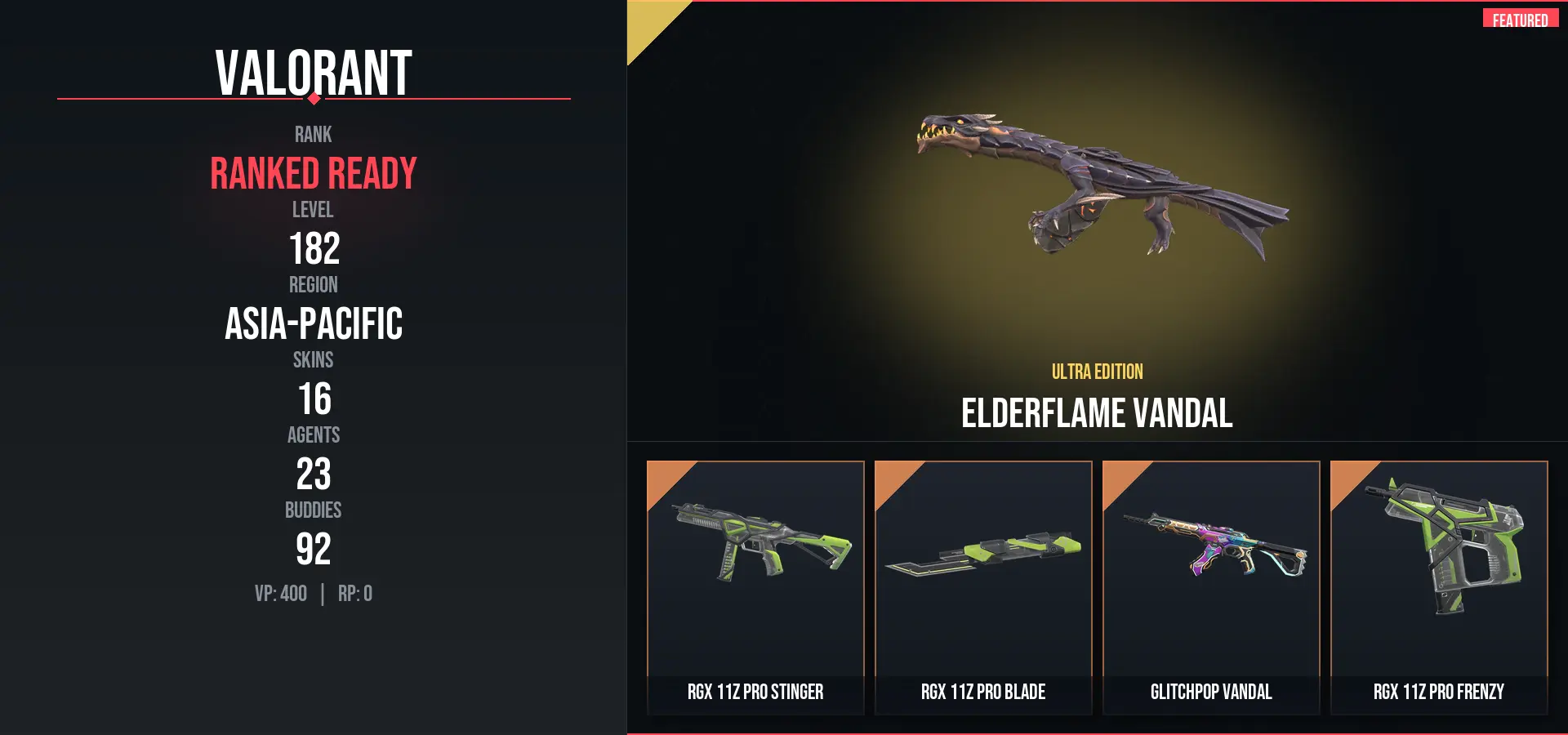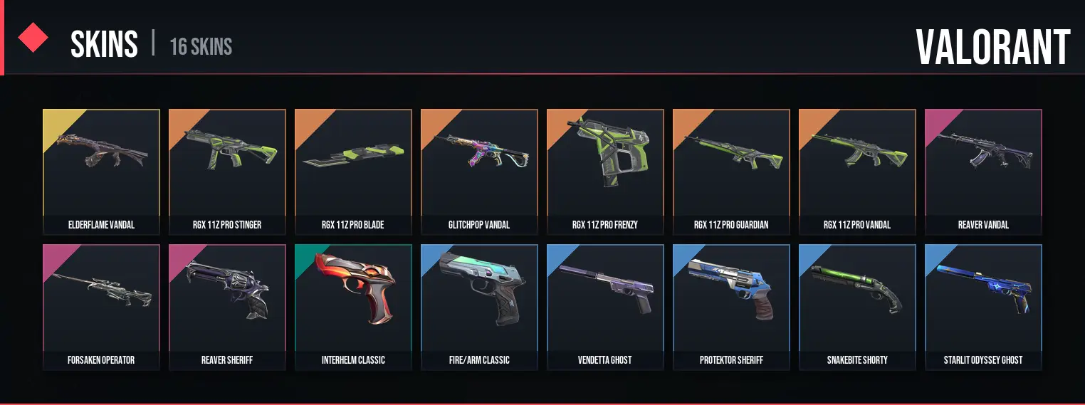 16 Skins / 23025 VP SPENT / Full RGX 11Z Pro Bundle + Reaver 2.0 Bundle / Elderflame Vandal / RGX 11z Pro Stinger / Glitchpop Vandal / RGX 11z Pro Guardian / Reaver Vandal / Forsaken Operator