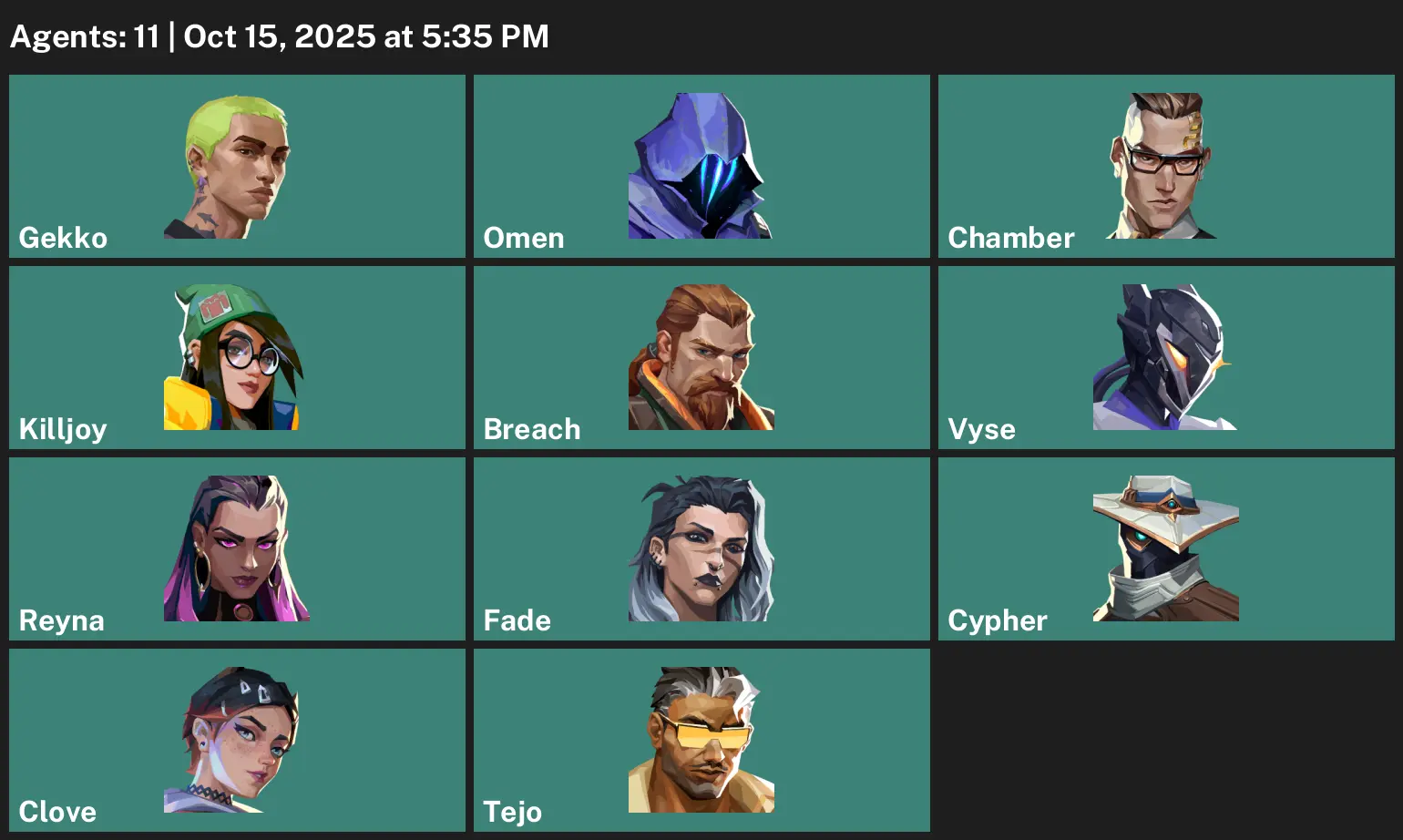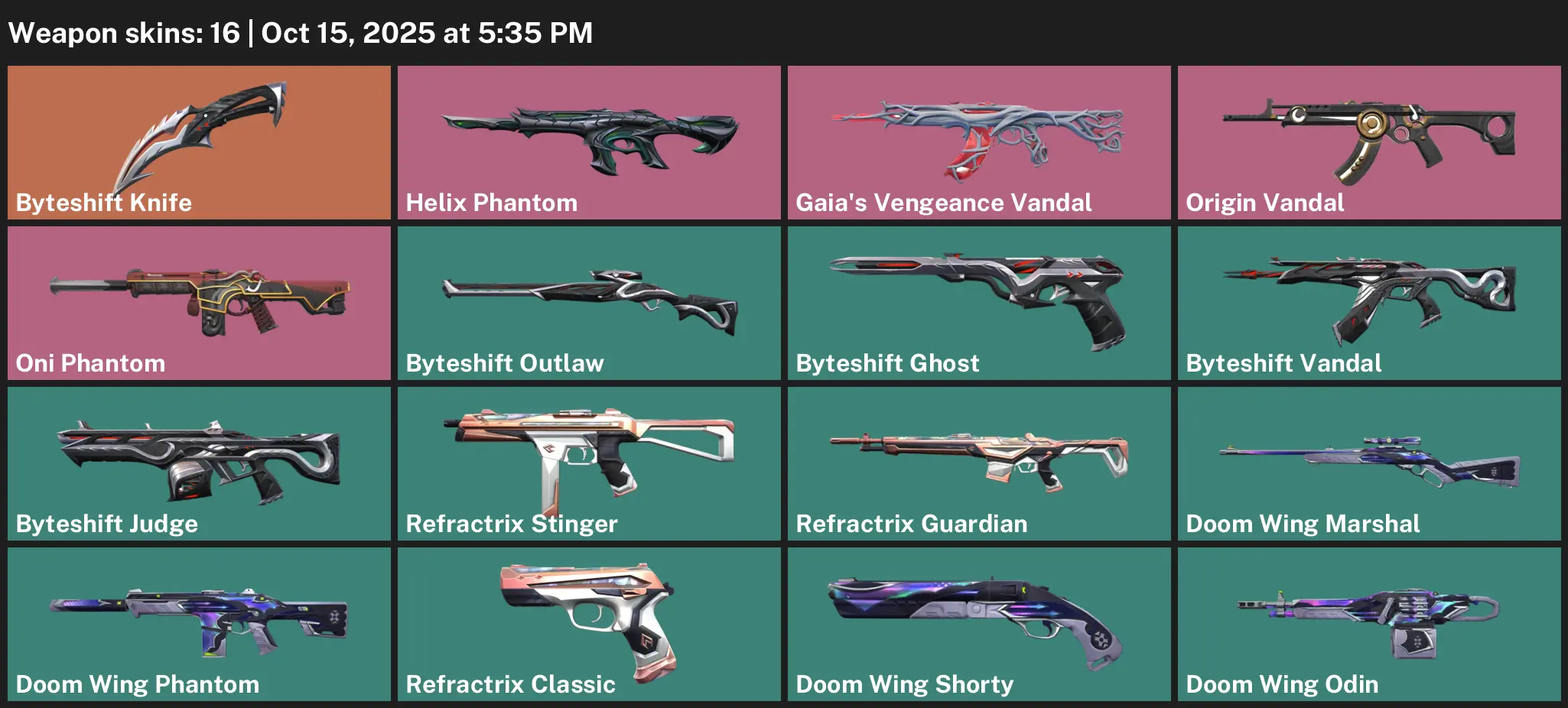 🍦 AP 🙂 Unranked 🥯 16 Skins 👾 3740 VP 🤬 11 Agents 🥱 Value: 7100 VP 🐋 Byteshift Knife 😬 Helix Phantom 👹 Gaia's Vengeance Vandal ⌚️ Origin Vandal 🧆 Oni Phantom ⚒ Byteshift Outlaw