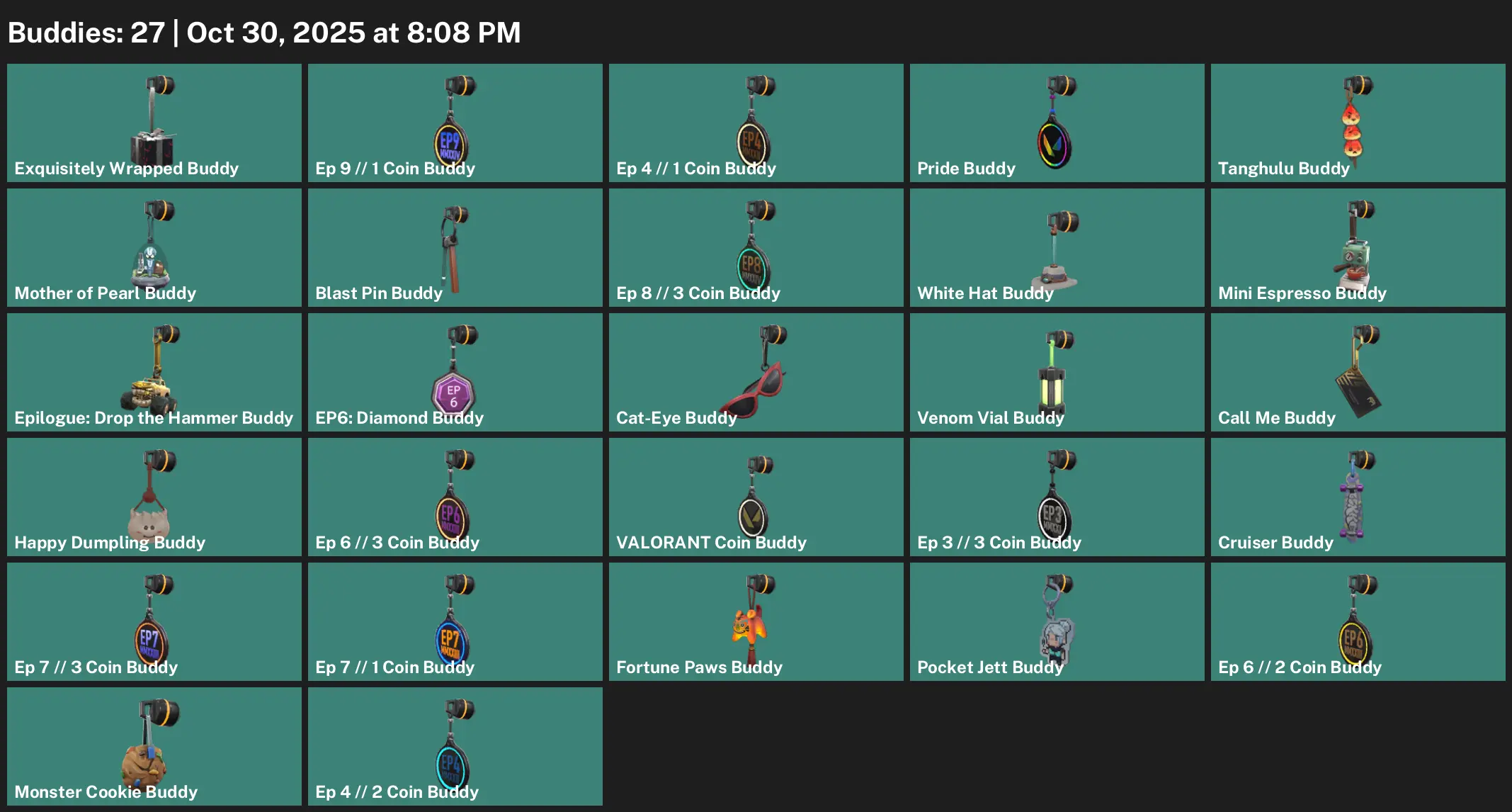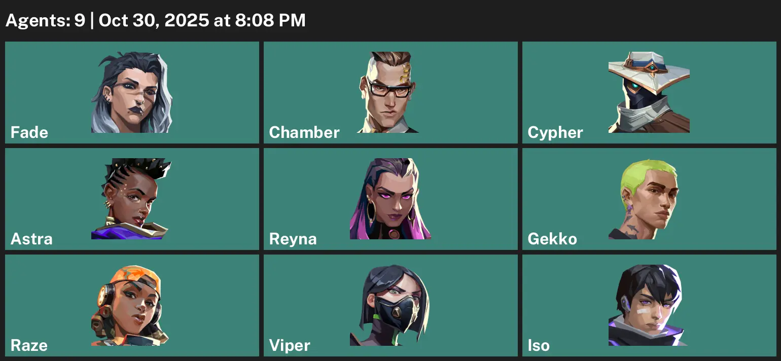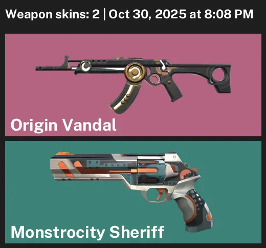 📨 AP 😙 Unranked 🦠 2 Skins 🫶 285 VP 🧴 9 Agents 🌲 Value: 1775 VP 🕷 Origin Vandal 🗞 Monstrocity Sheriff