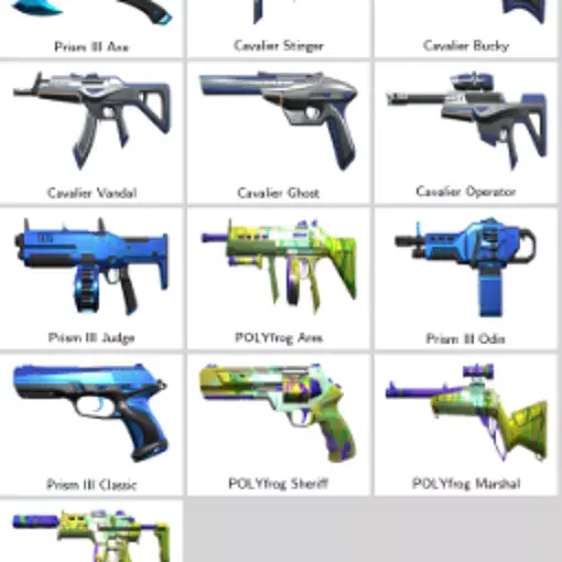 EU 13 skins Bronze III Prism III Axe+Cavalier Stinger+Cavalier Bucky+Cavalier Vandal+Cavalier Ghost+Cavalier Operator+Prism III Judge+POLYfrog Ares